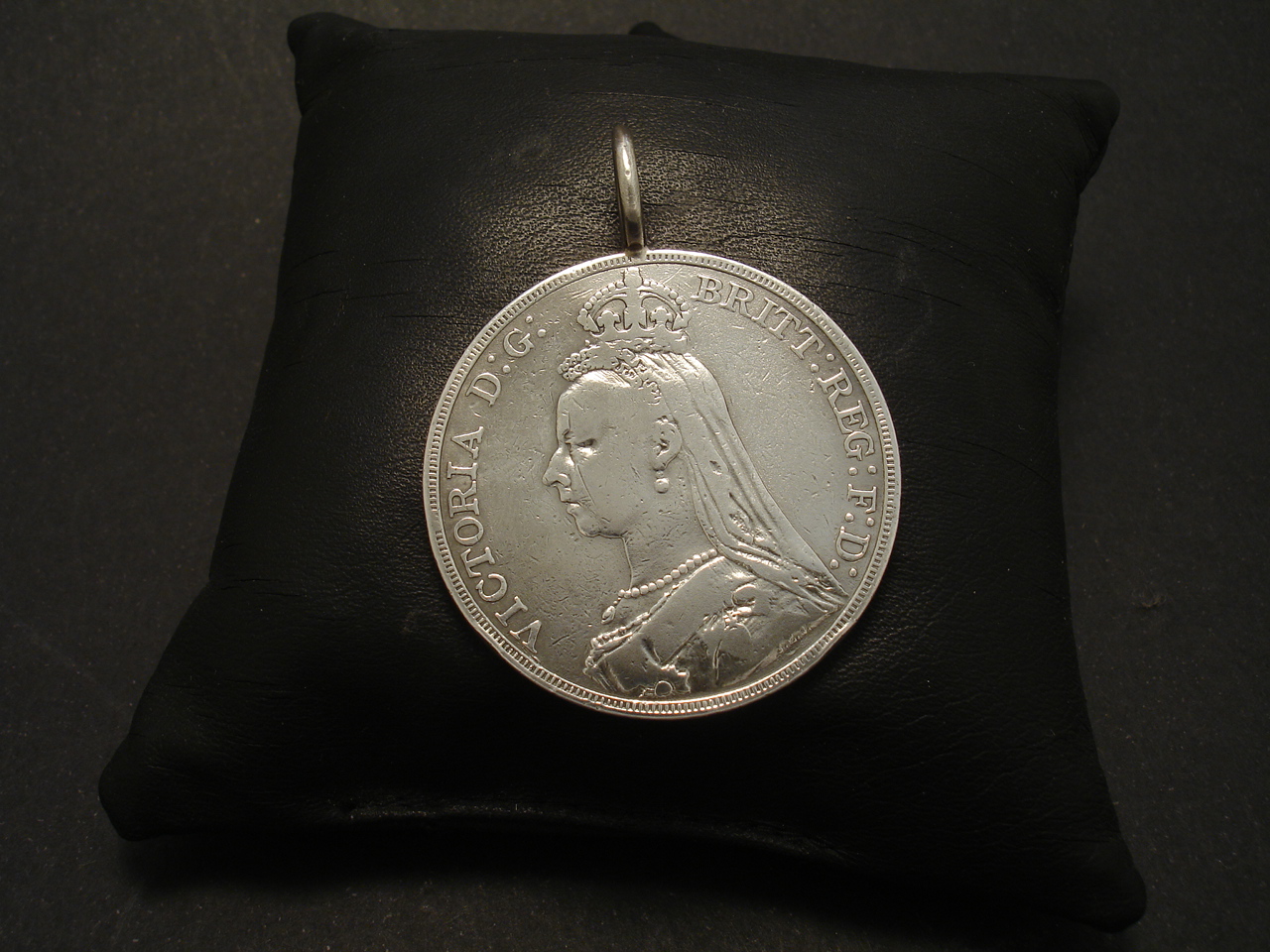 1889 Victorian Silver Crown coin pendant, Queen Victoria on face, St George and Dragon on reverse, all with good definition, the ring for chain solid and properly fixed with minimum damage to coin.