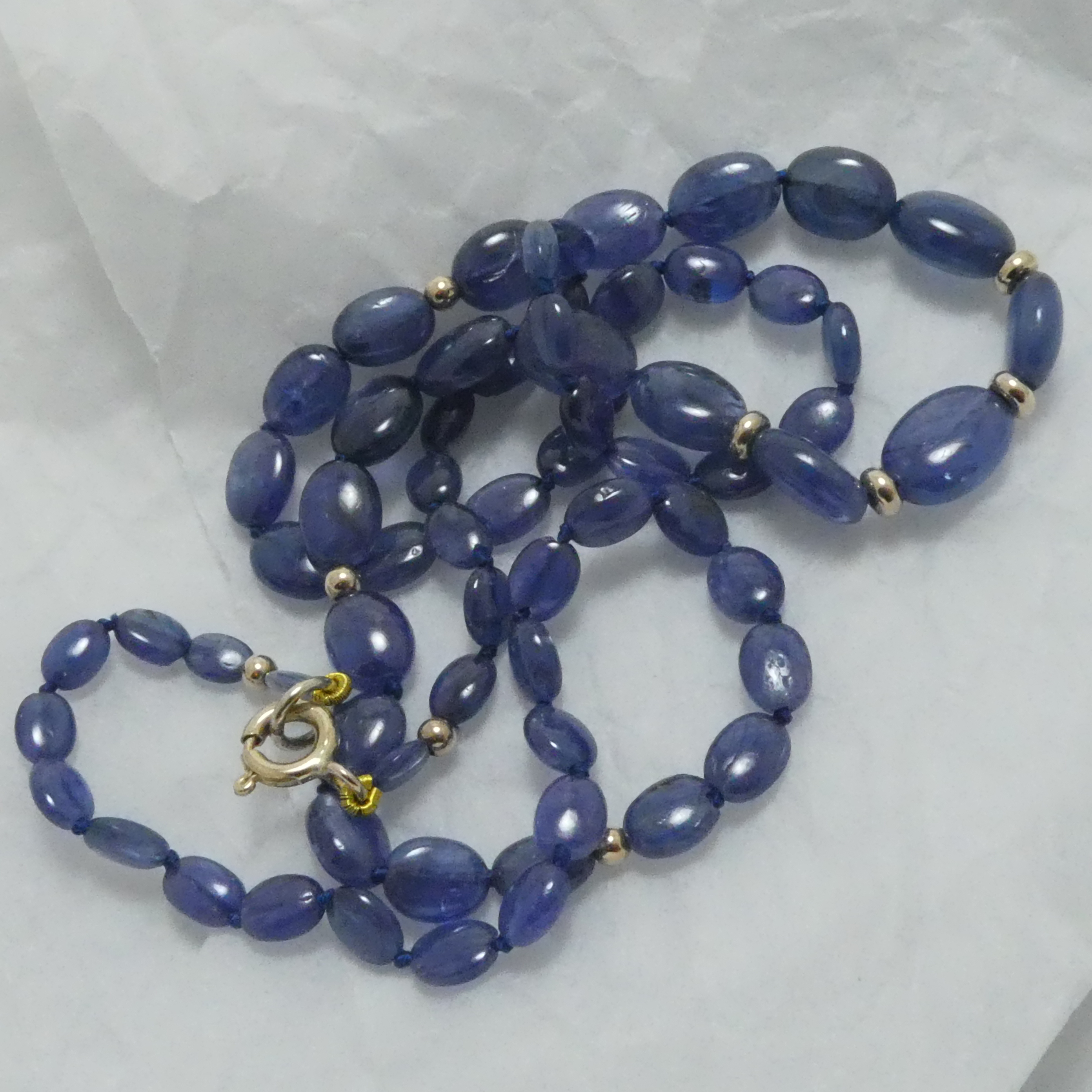 58ct Natural Sapphire strand, the beads basically hand-cut and graduated, all slightly different, cut in a flattish oval shape, then tumble-polished. This lozenge shape is an ancient bead form, pleasing both to the touch and to the eye.
