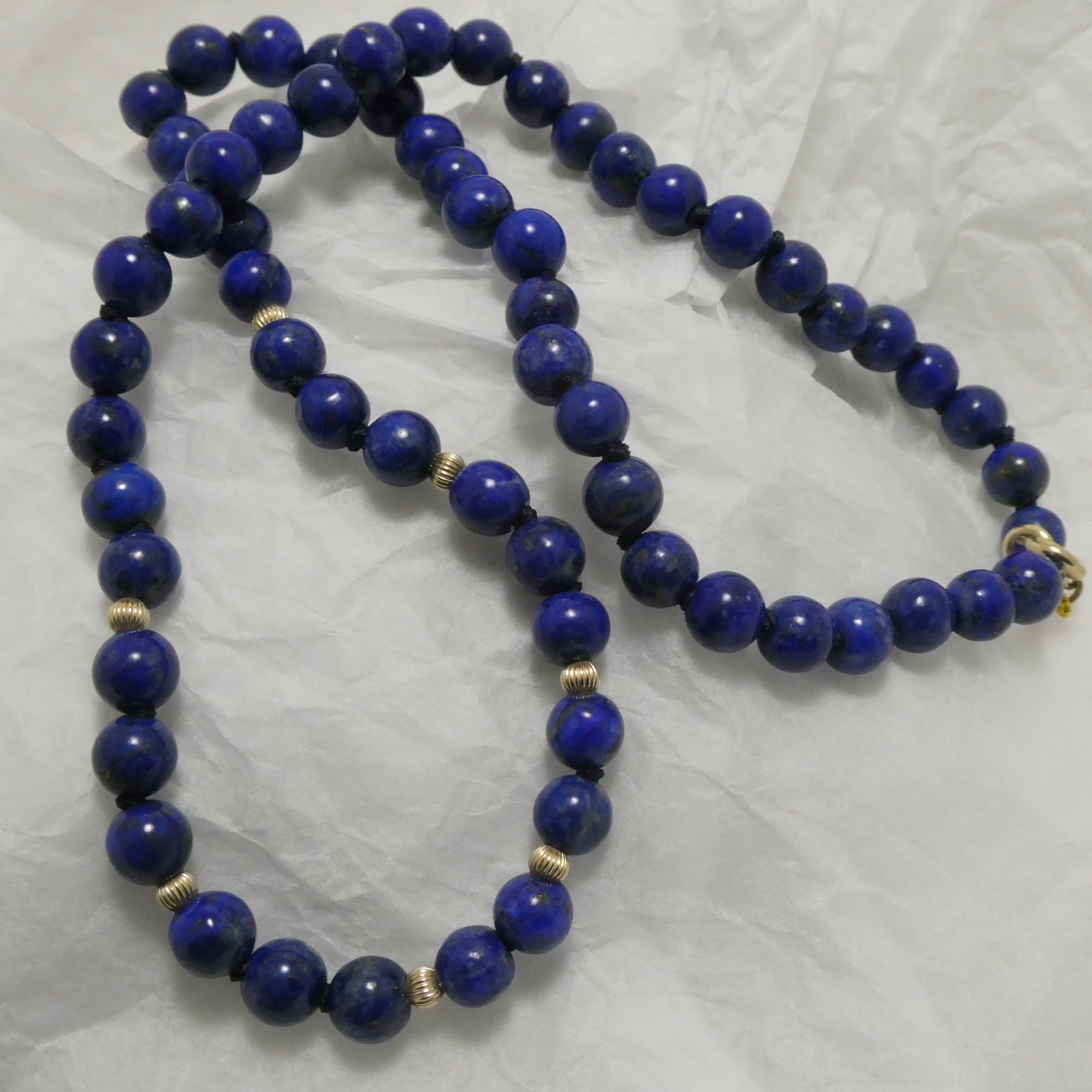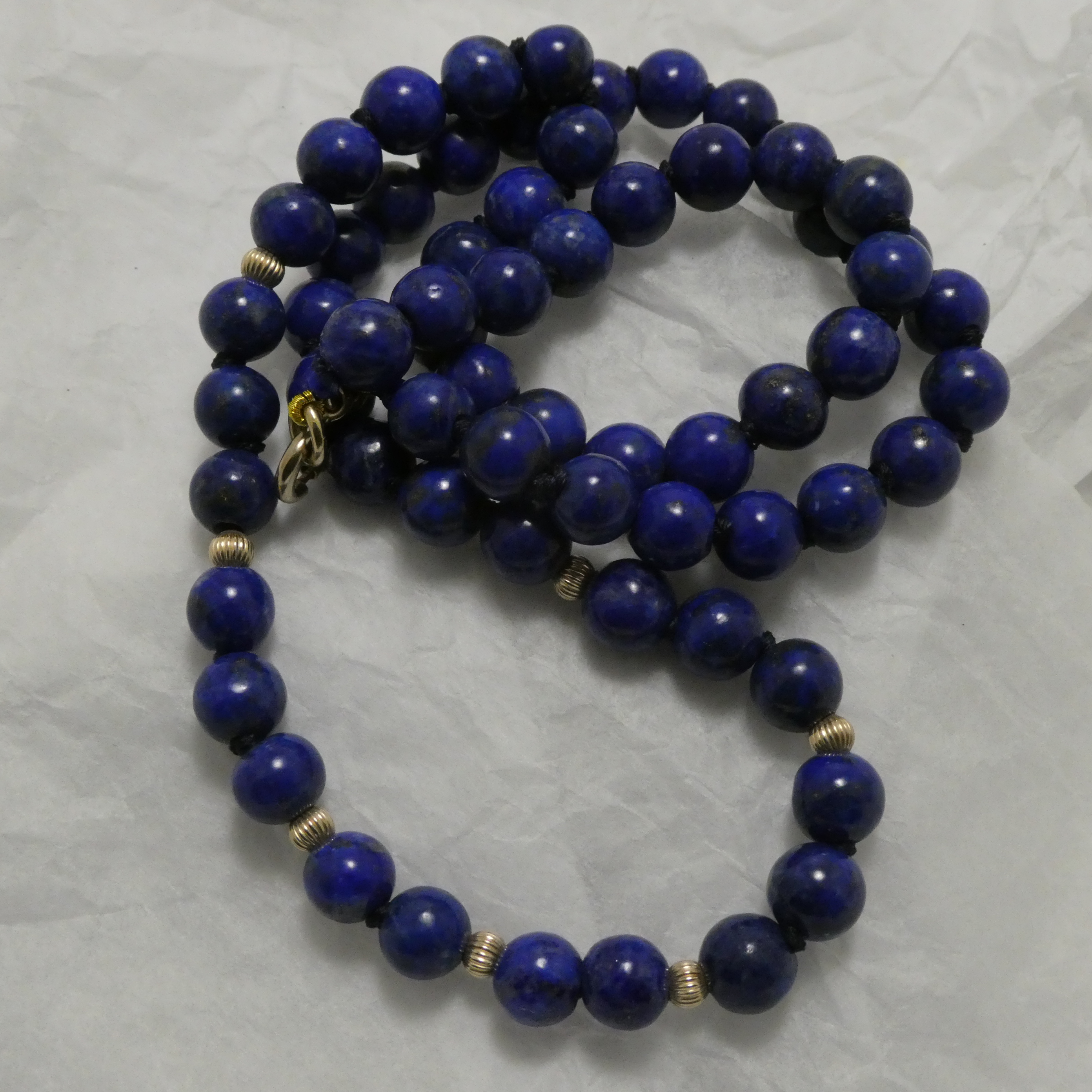 The above 7mm Lapis bead strand is professionally strung in Sydney on multi-strand blue silk, knotted throughout, with seven Italian-made 9ct Gold fluted beads around the front, 9ct Gold end rings and 9ct Gold spring clasp.