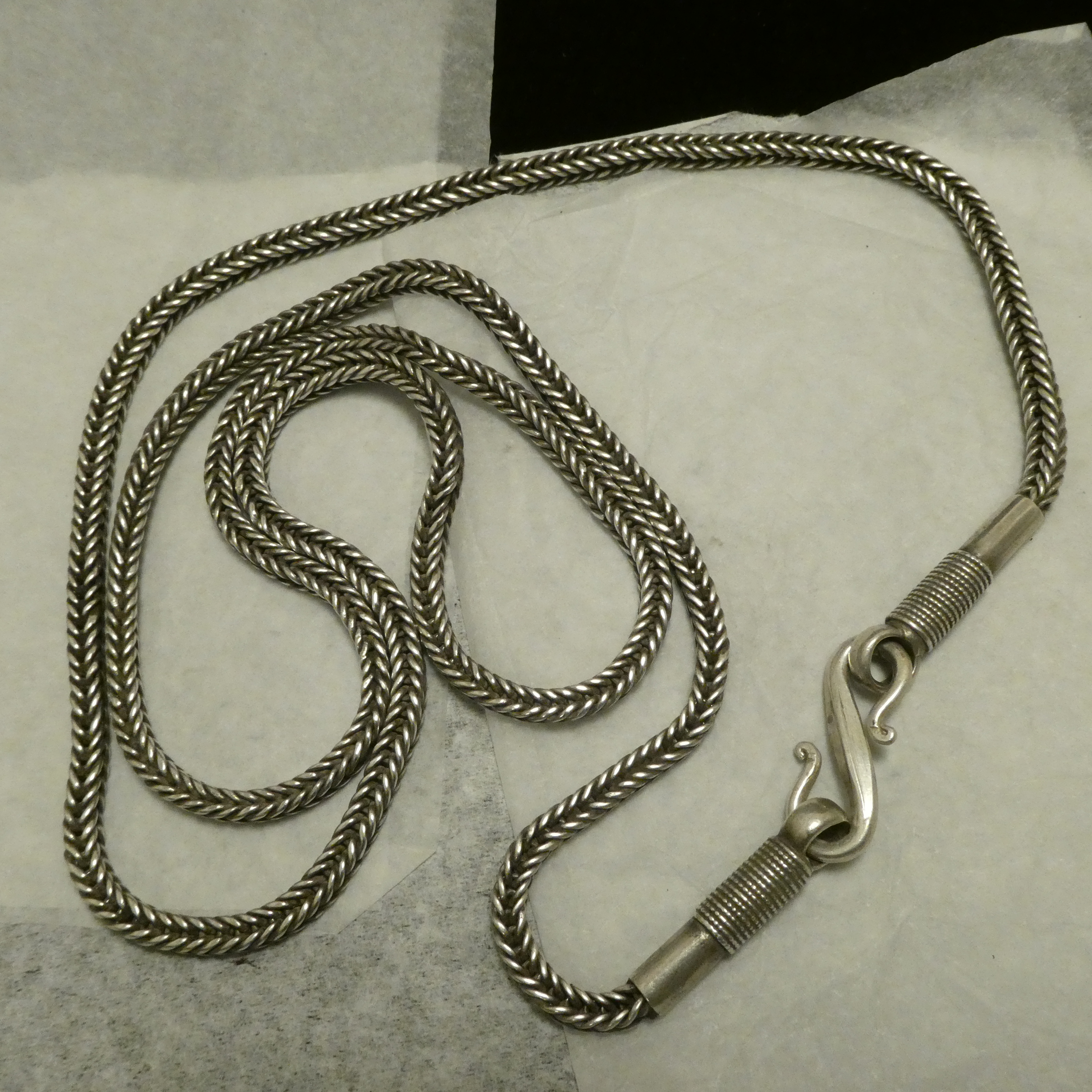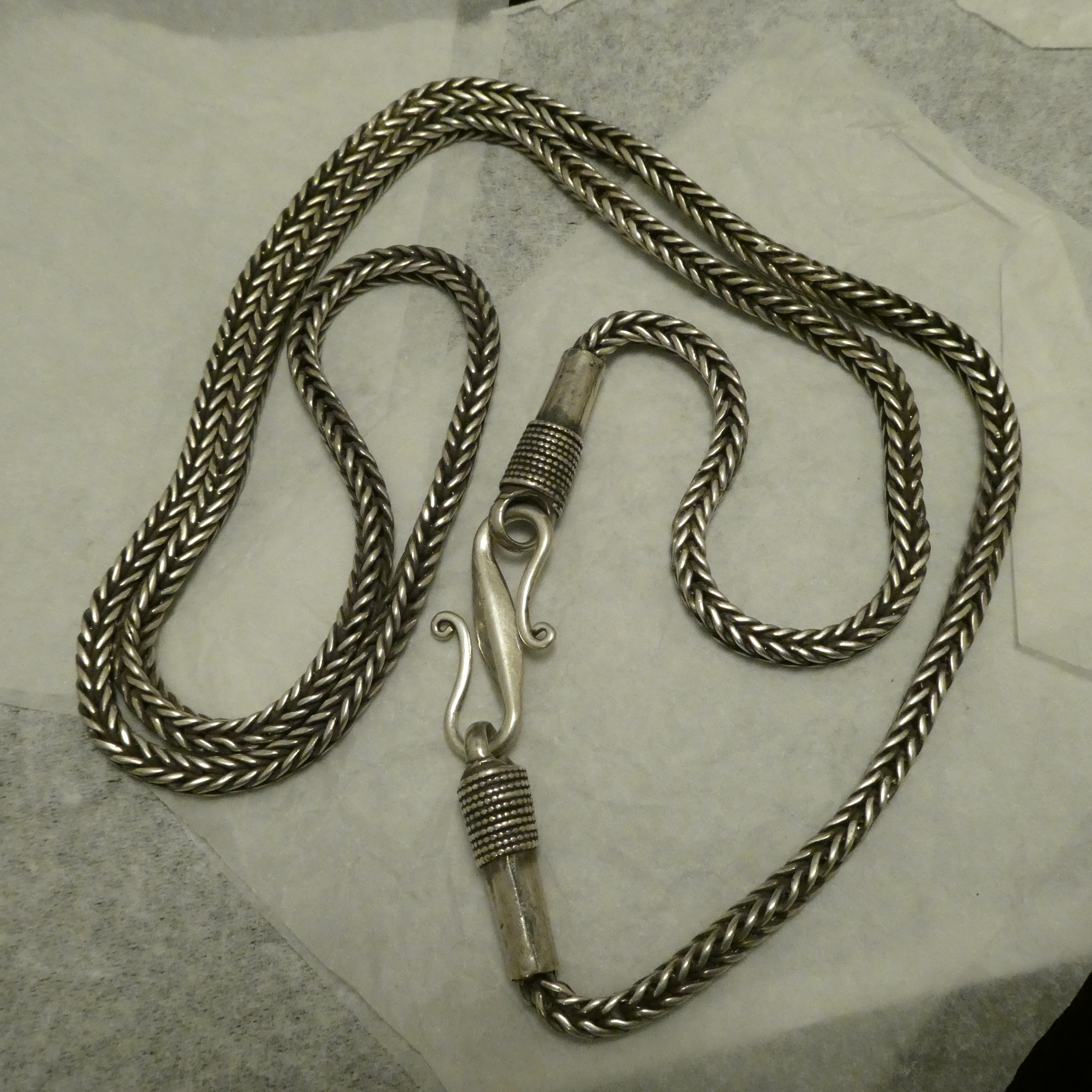 84cms Rare Old Silver chain necklace, handcrafted in one of the most ancient of all chain types, the “foxtail” or “chevron” wire link, this example out of Kerala South India around the 1950s.