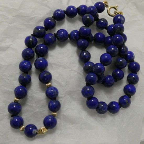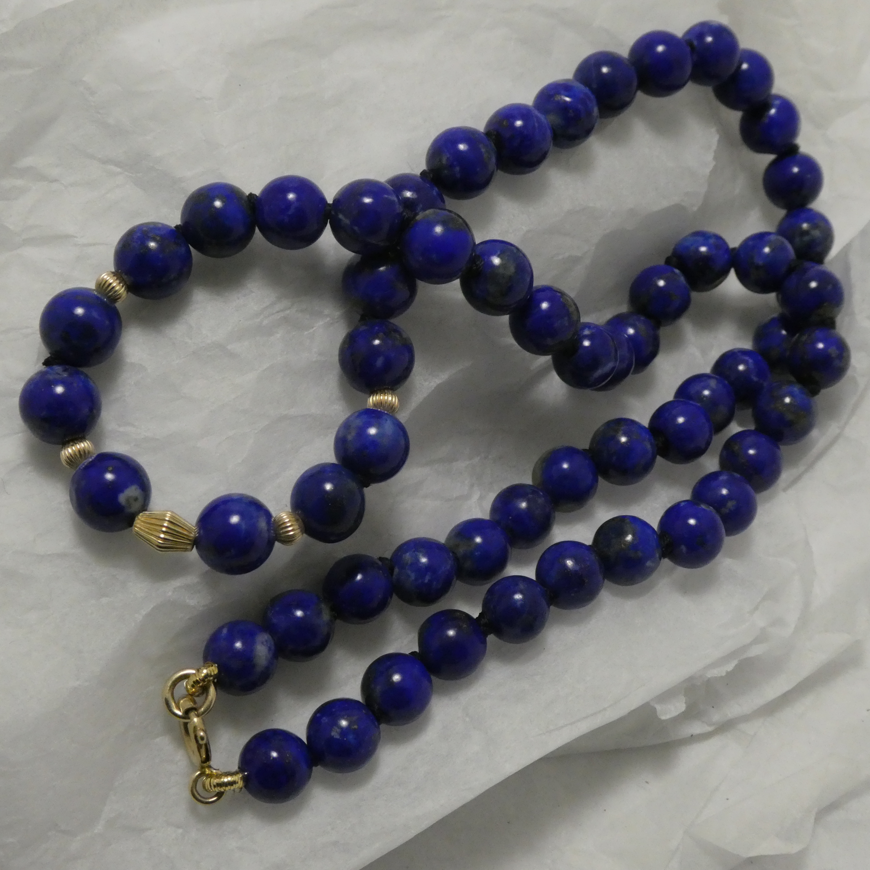 8mm Lapis Lazuli bead necklace, matched fine lively deep blue, proper ultramarine blue, natural Afghanistan gemstone rock from the ancient mines of the rugged north-east of Afghanistan, with Italian-made 9ct Gold fluted beads around the front, finished with 9ct Gold ring, 9ct Gold spring clasp.