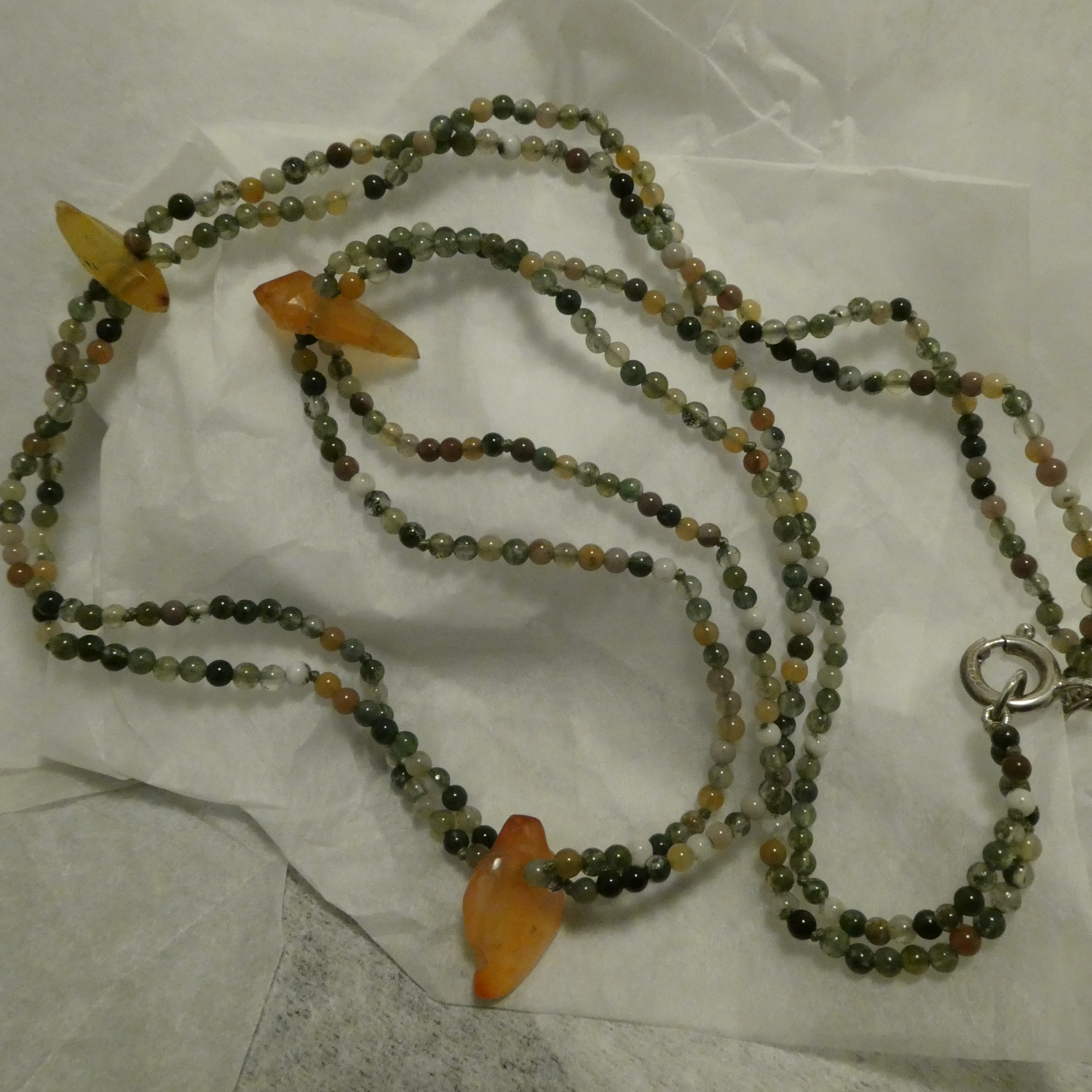 Agate Gemstone bead necklace, a double strand of tiny 2.3mm multi-coloured Agates, with three ancient handcarved Cornelian “arrowhead” beads ( the Cornelians probably of Persian origin, handcut well over a century ago and quite possibly centuries ago; the gemstone quality of the Cornelian excellent and its source would have been the ancient mines of Gujerat on the west coast of India).