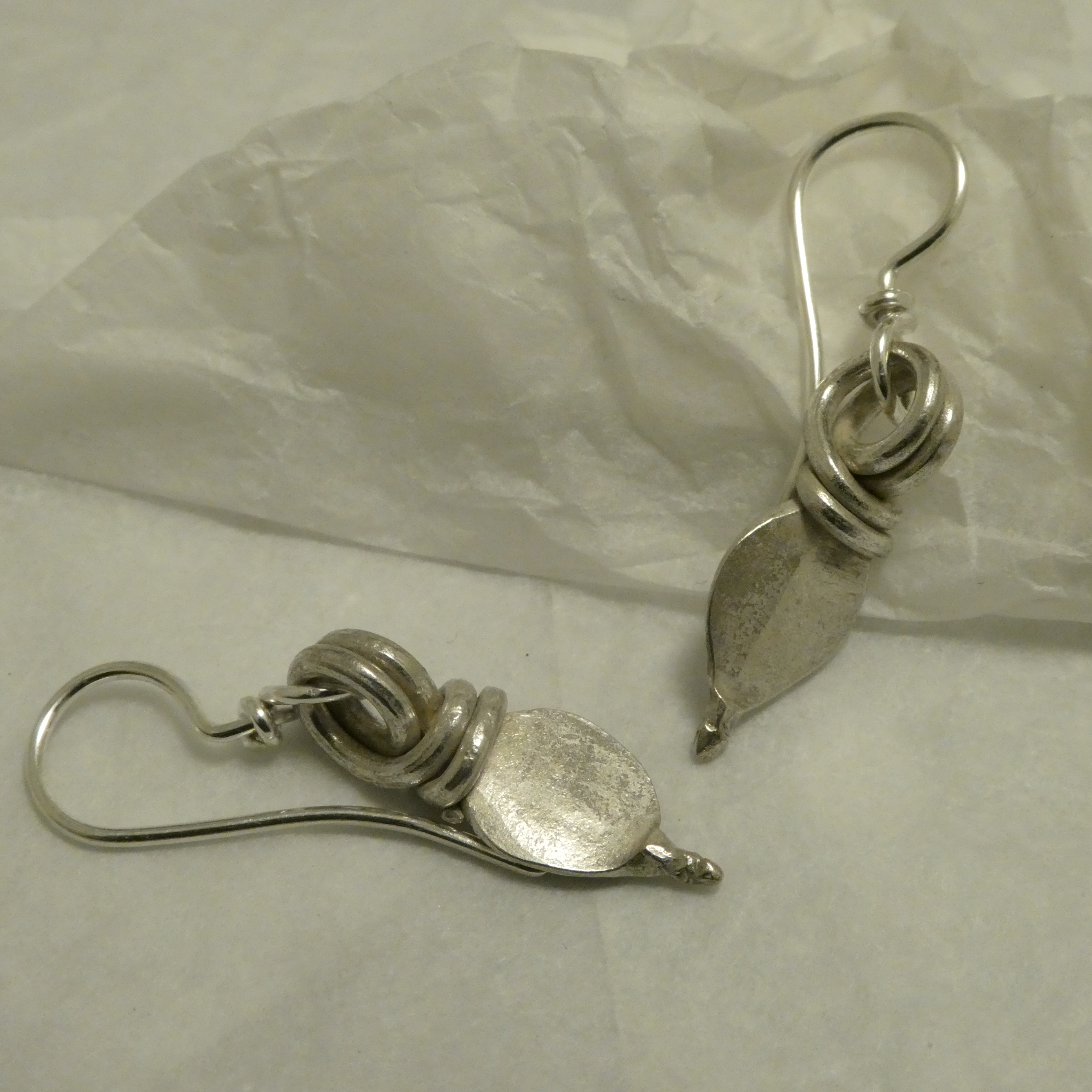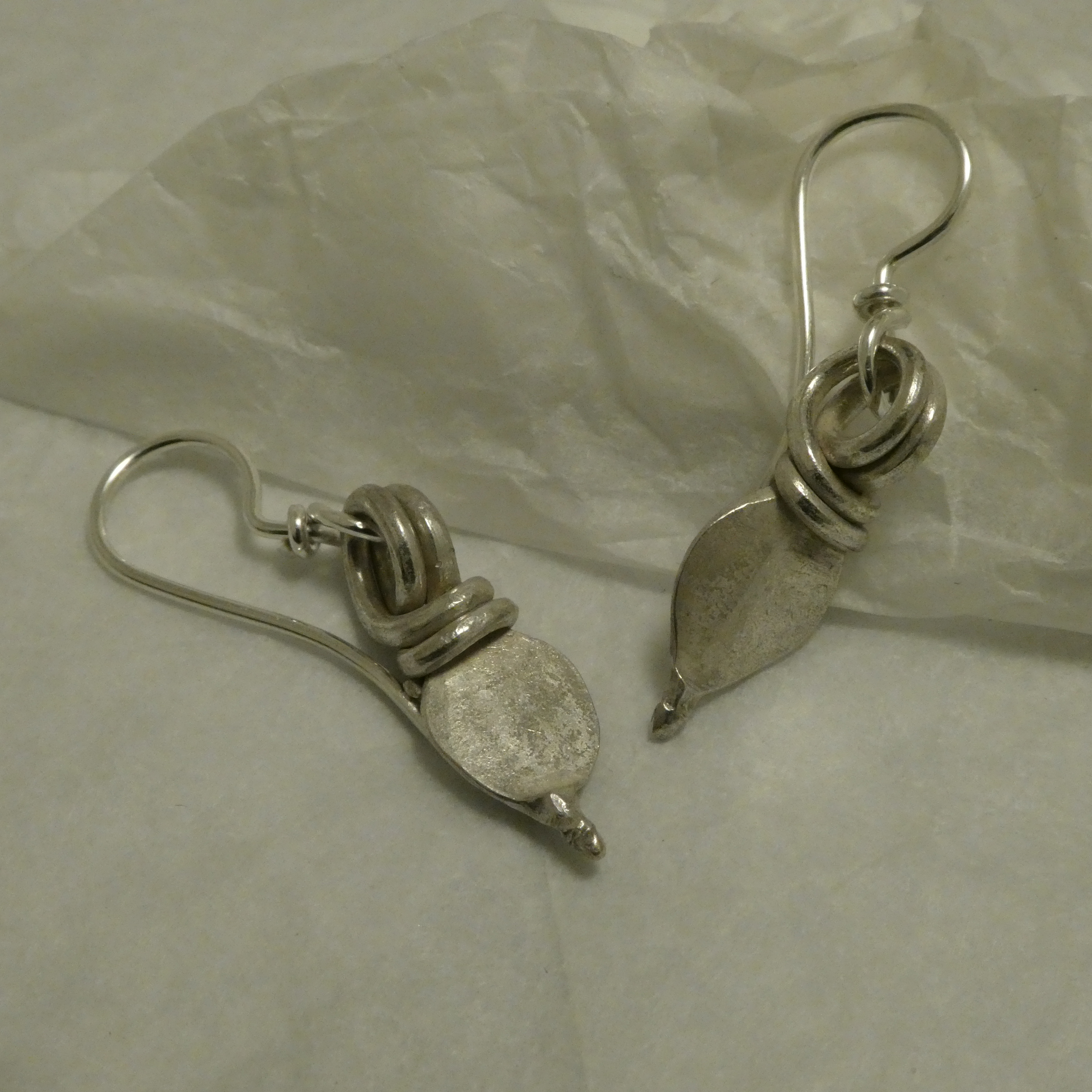 SOLD. Ancient Form, Tribal Silver, in old handcrafted Silver pendant pieces, made to earrings in Sydney with hand-worked 0.6mm Silver round wire. The origin of the two pendant pieces tribal Gujerat, west India around the mid 1900s.