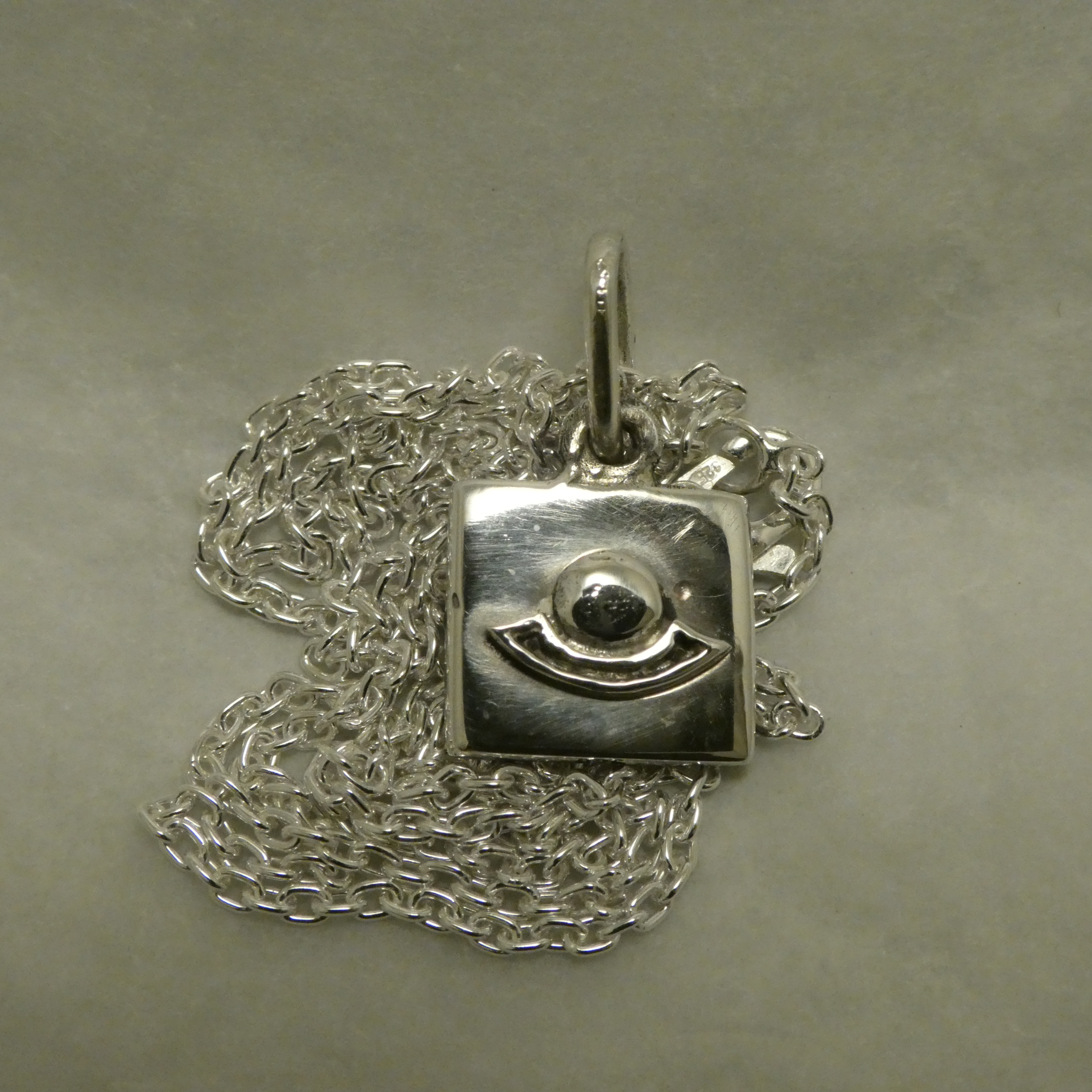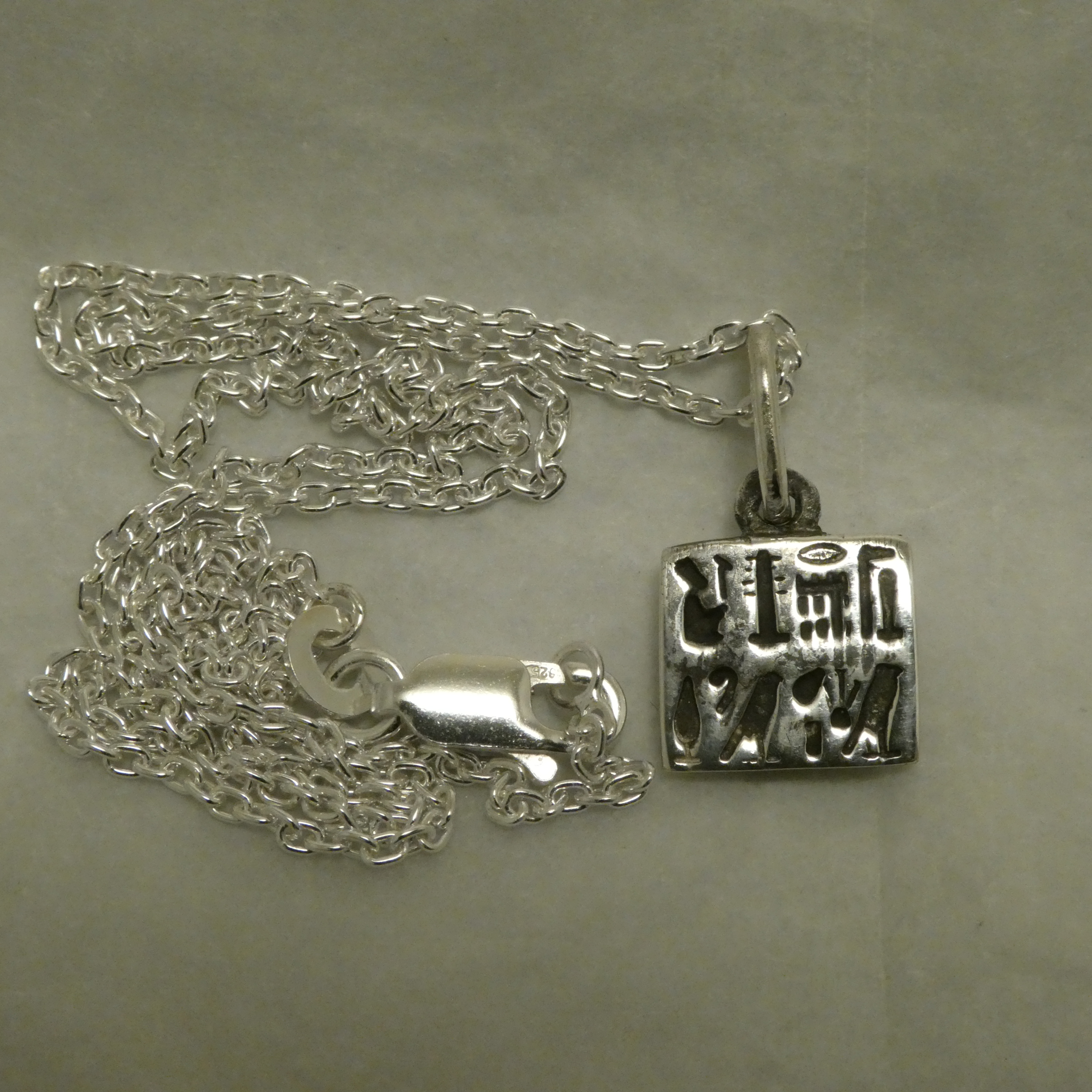Ancient Hieroglyphs, a high official seal (400BBC Valley of Thebes), in a 10mm square pendant of solid Sterling Silver, with the sacred symbol of Ra, the Sun God, on reverse, riding across the sky.