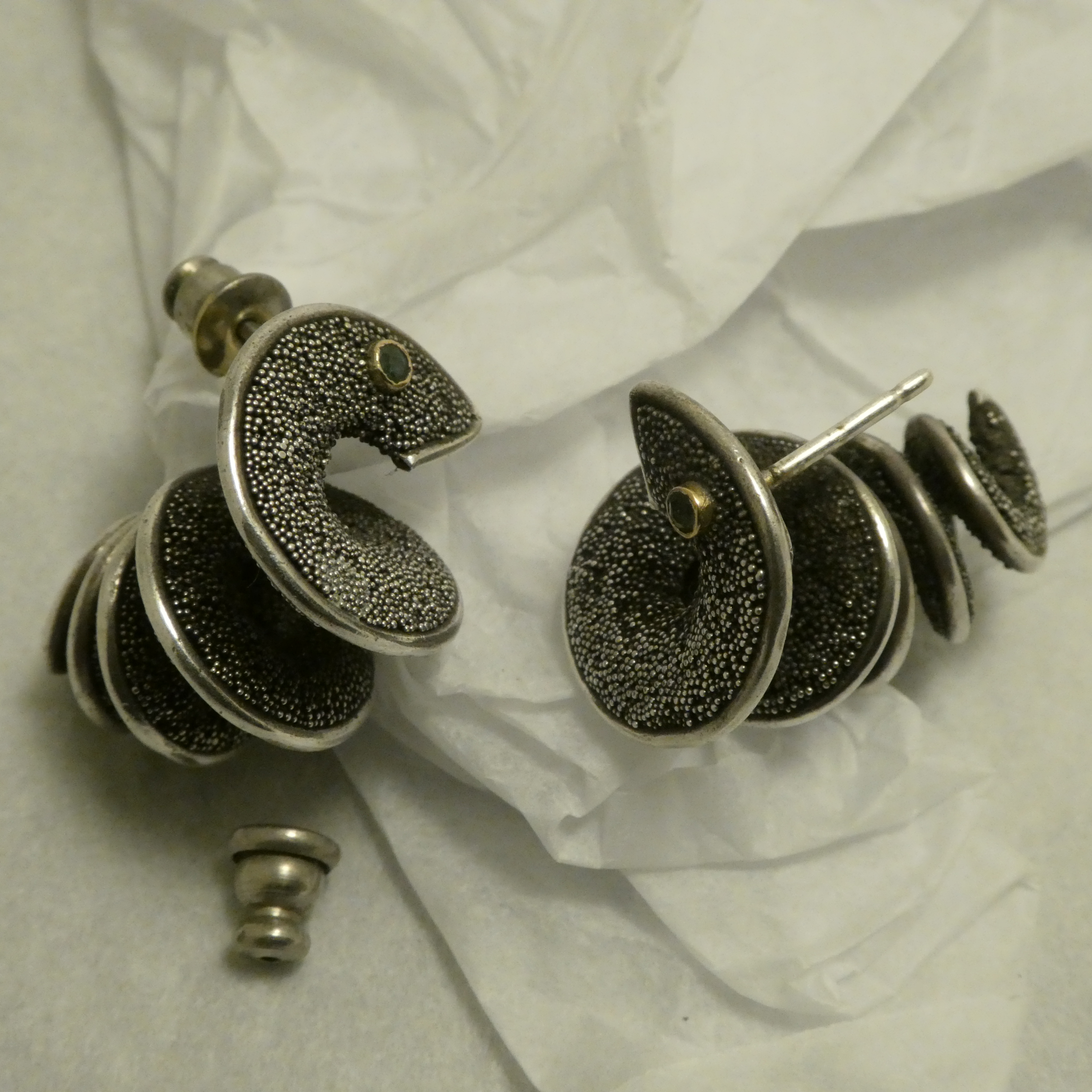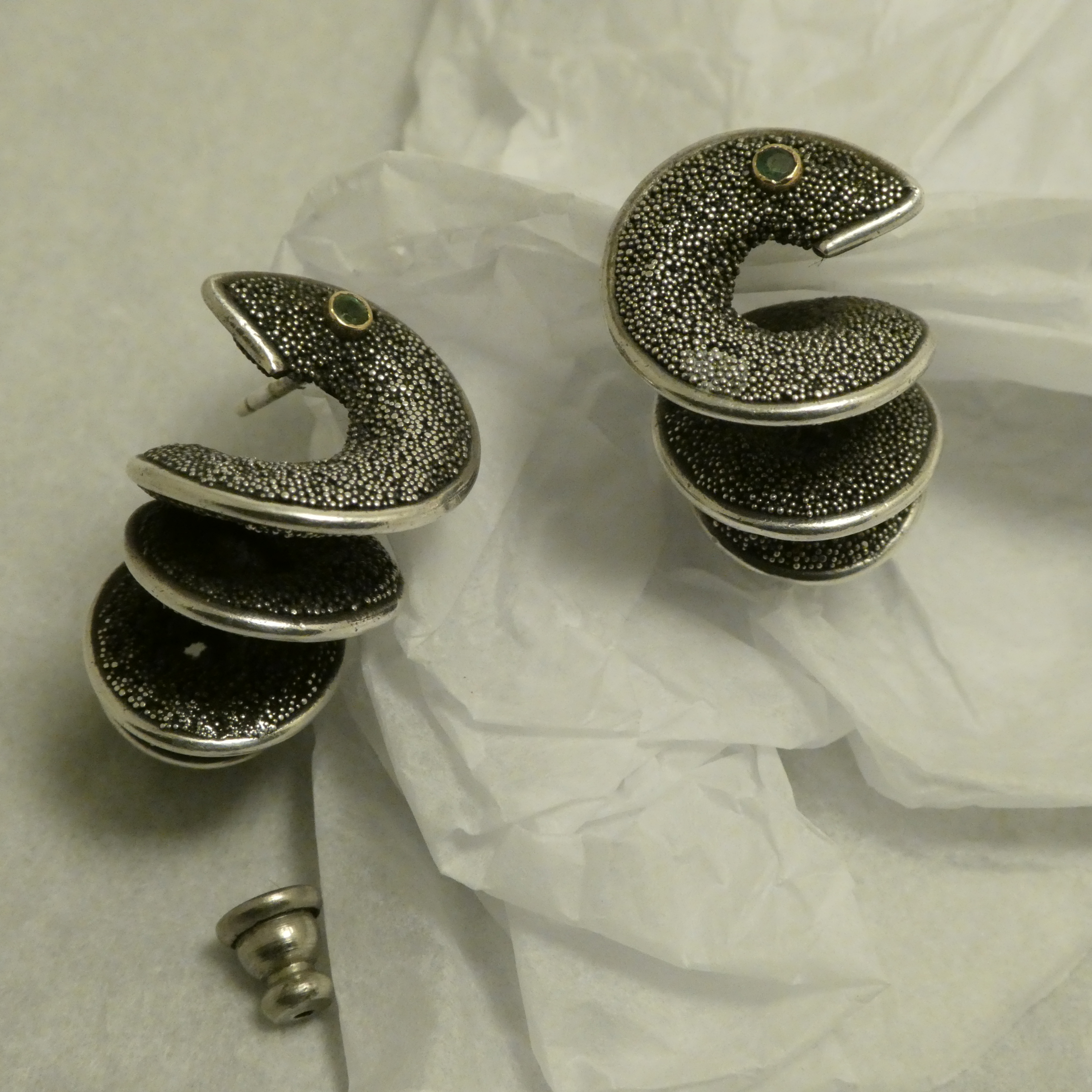 Another nice touch in these Coiled Earstuds is the little natural Emeralds set in 20ct Gold at the top of the coils, the stud ear-post directly behind the setting.