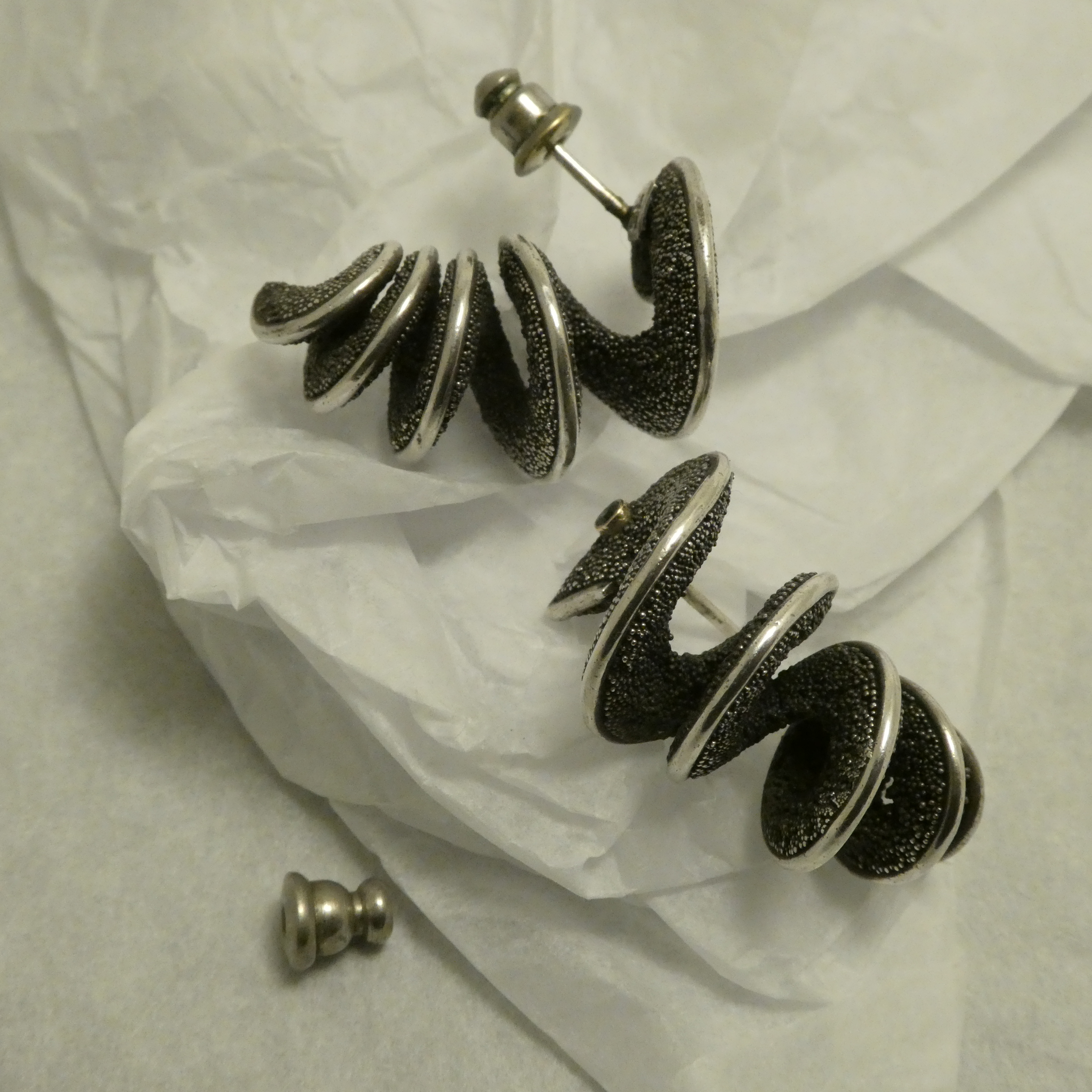 Coiled Earstuds of handcrafted Silver. Small natural Emeralds set in 20ct Gold at the tops.