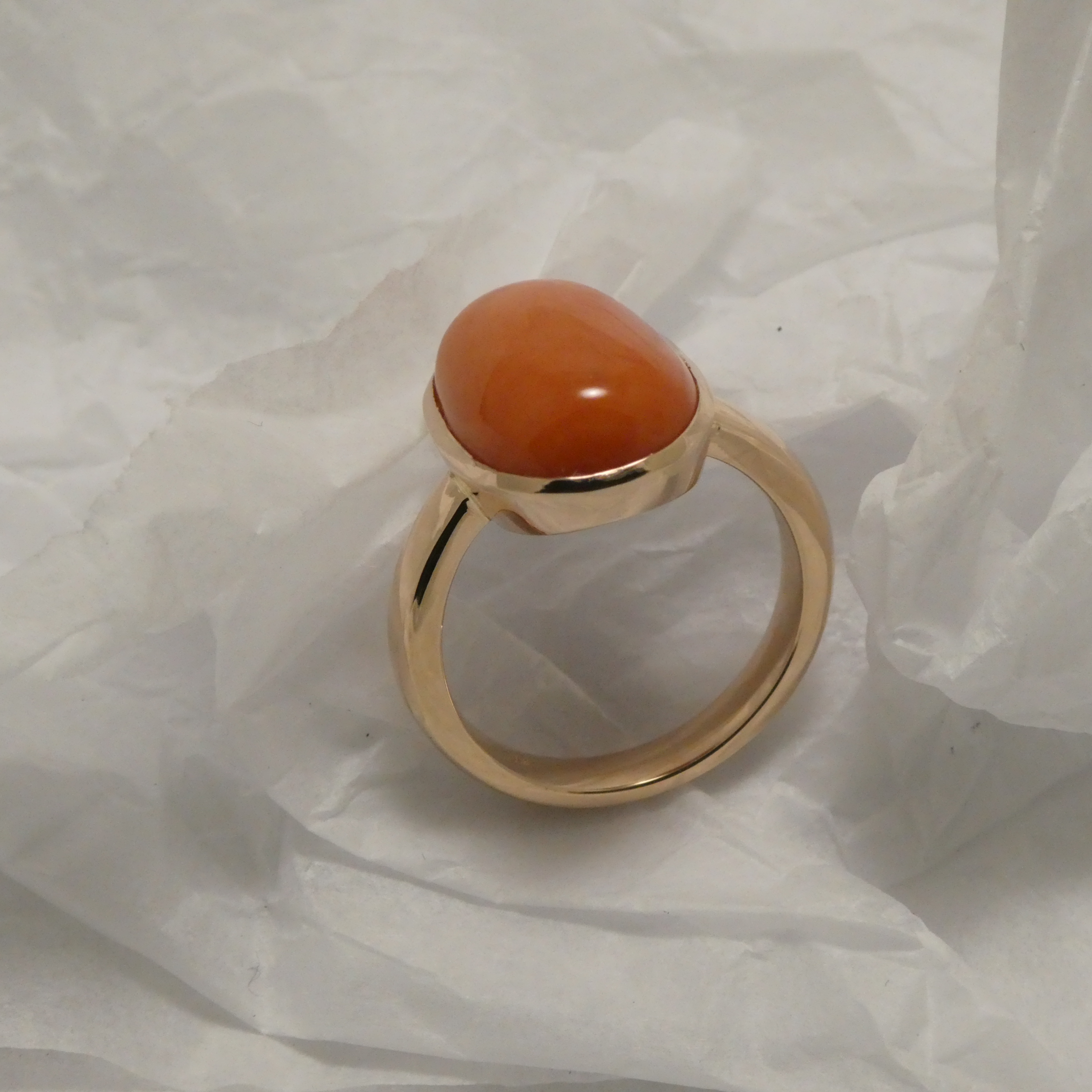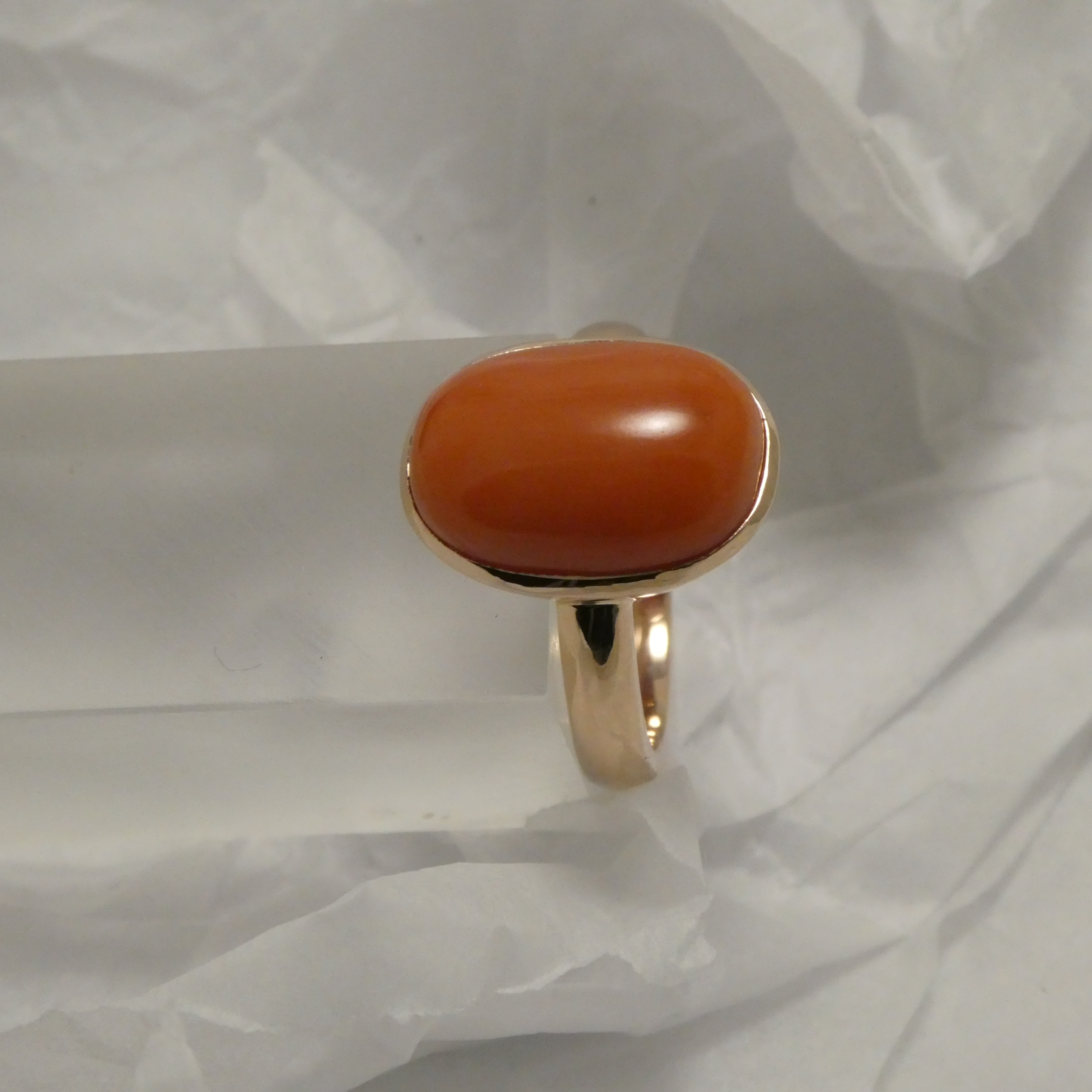 The ring setting is crafted in Sydney specifically for the Coral gemstone, handcrafted in 9ct Rose Gold, in a very nice shade of Rose Gold, and very solid, its band a uniform 3.4mm width, thickness tapering from 2.4mm at top where it meets the setting, to 1.6mm thickness at the rear.