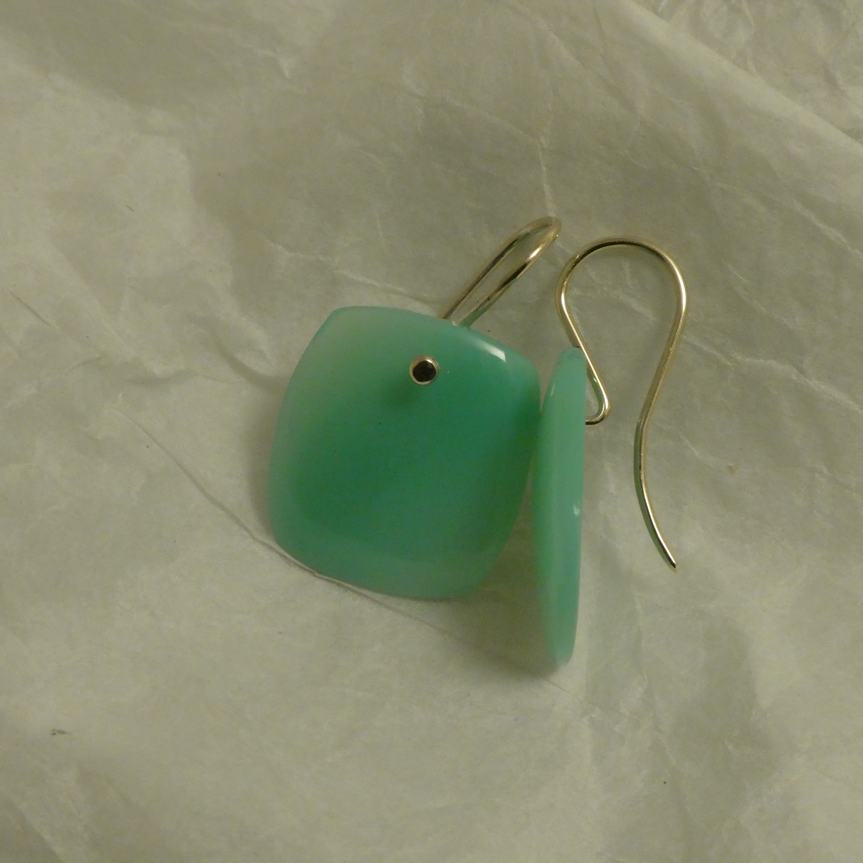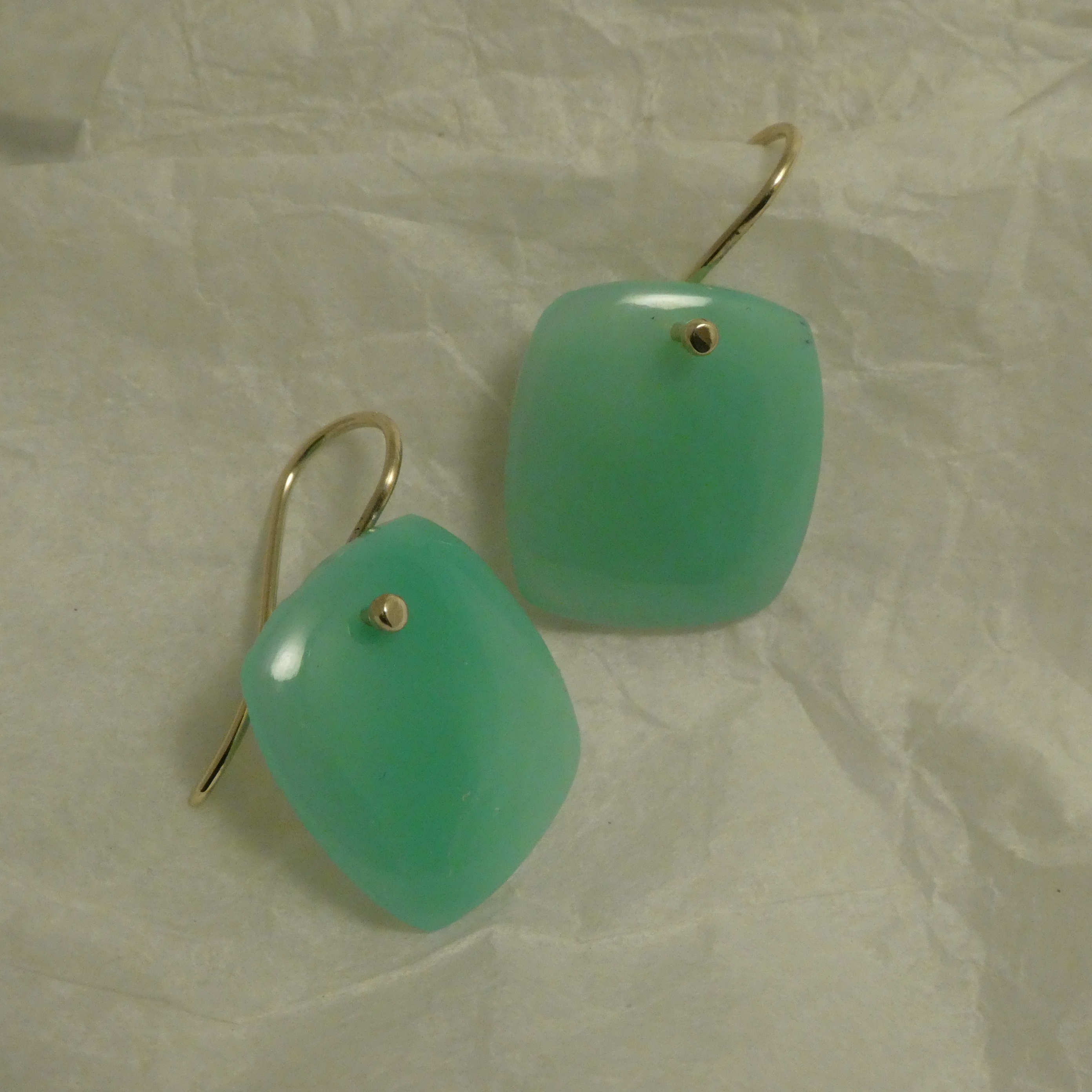 Fine Australian Chrysoprase. The above handcut cushion-shaped pair are of Queensland origin. Chrysoprase is a green Chalcedony, a form of Quartz, the green colour due to the presence of nickel. There exist a number of Chrysoprase sources world-wide; Australia is known for its consistent apple-green colour. Oddly enough, it is better known in Asia than in Australia, for its colour and appearance can be quite close to that of the highly-prized Imperial Green Jadeite, and, indeed, in Asia it is often called “Australian Jade”.