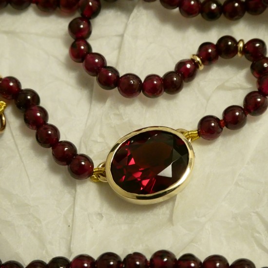 Garnet Necklace, 9ct Gold: in a setting Sydney-crafted in solid 9ct Gold, a cut oval of the finest gem-quality wine-red Garnet, as centre-piece in a strand of wine-red 4mm round Garnet beads.