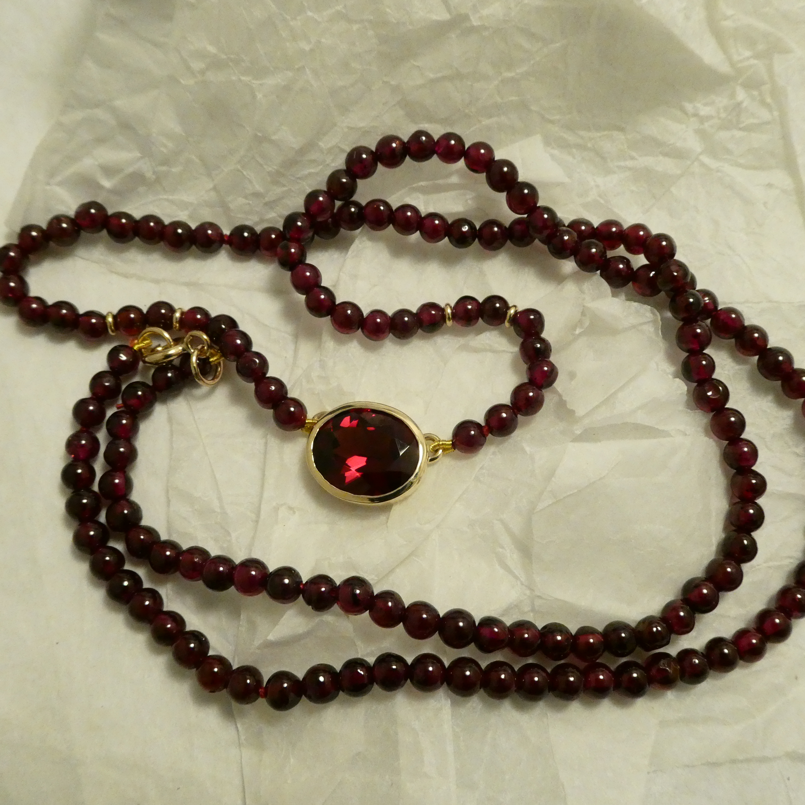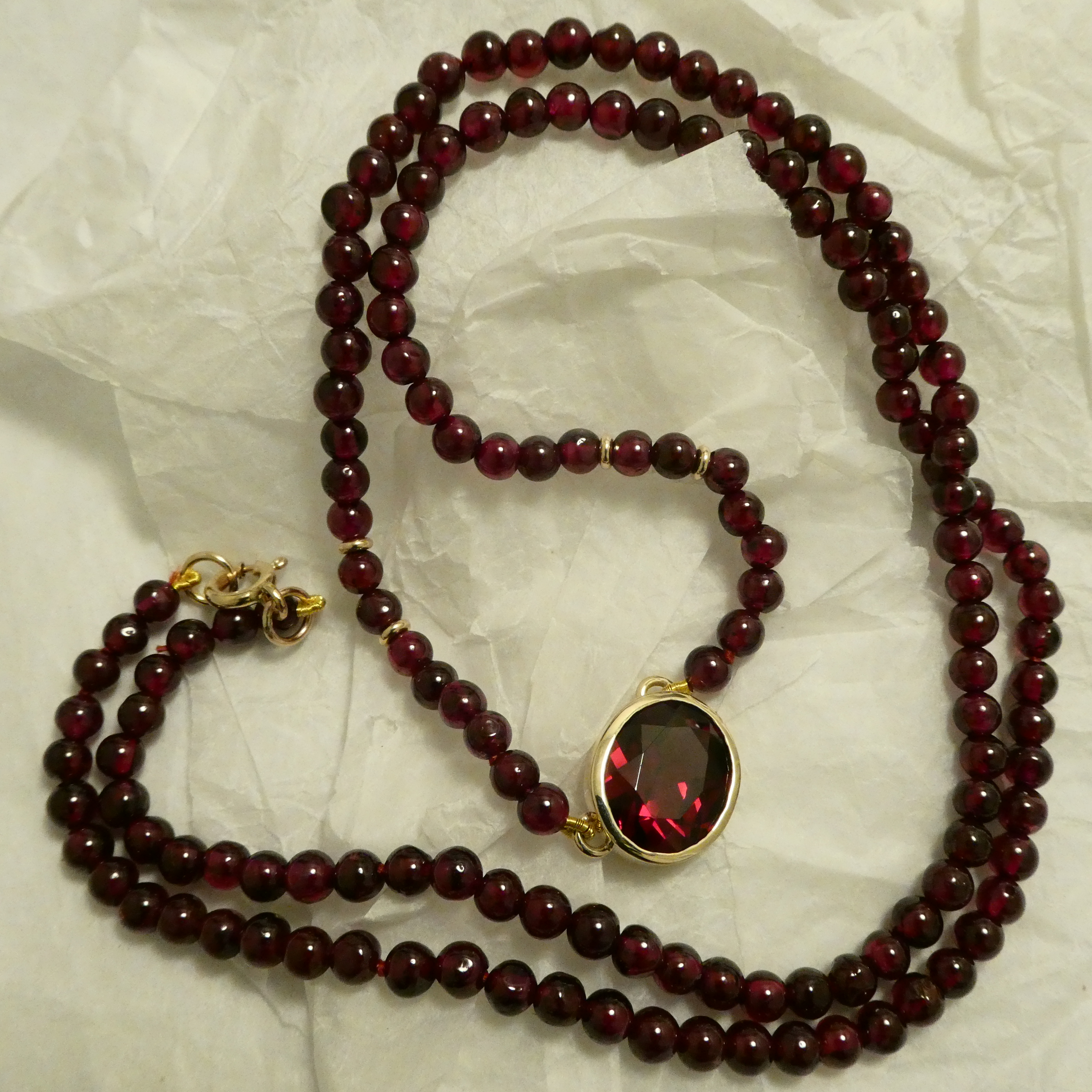 Garnet Necklace, 9ct Gold: in a setting Sydney-crafted in solid 9ct Gold, a cut oval of the finest gem-quality wine-red Garnet, as centre-piece in a strand of wine-red 4mm round Garnet beads.