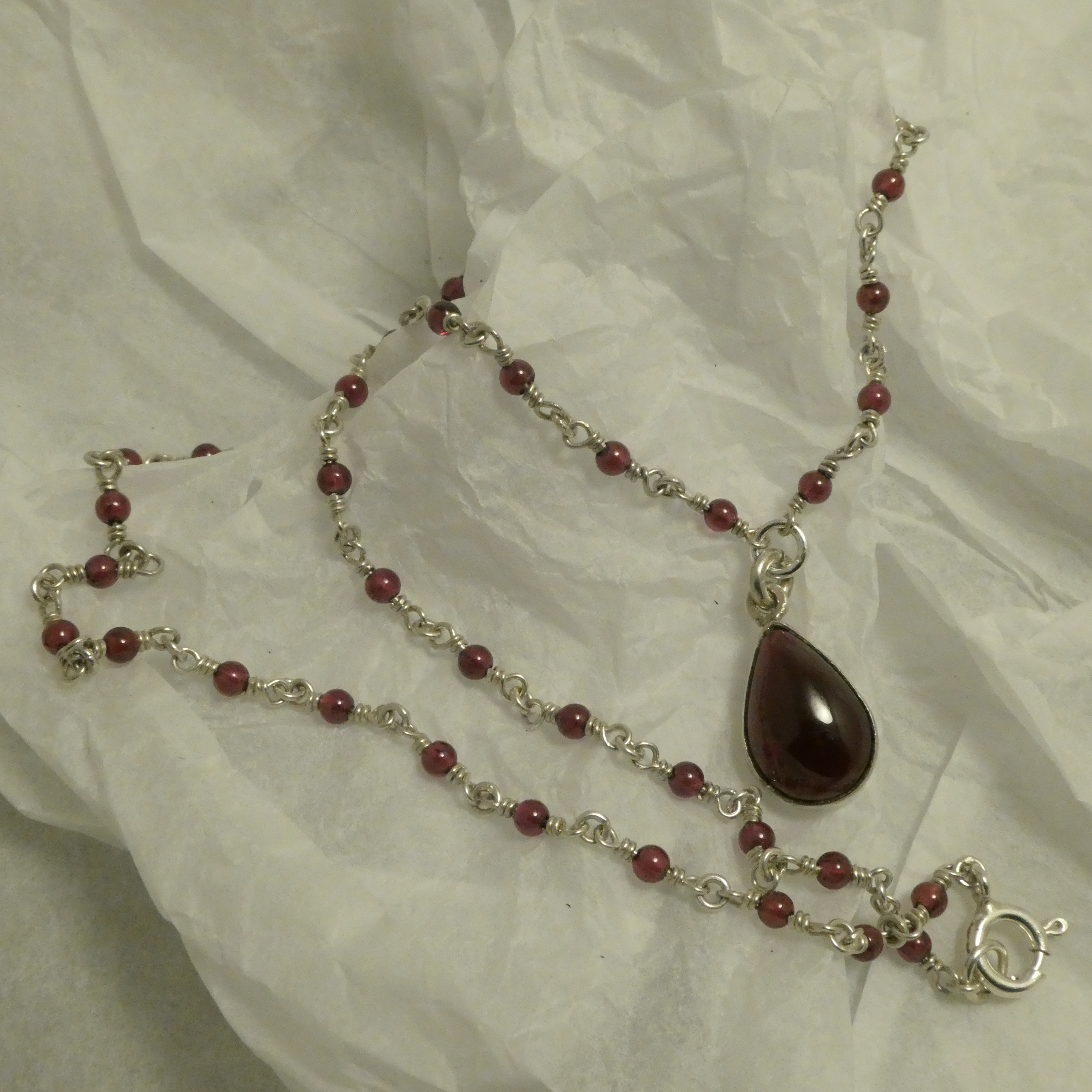All Silver work handcrafted, the twist wire-work securing the 42 sweet Garnet beads particularly time-consuming.