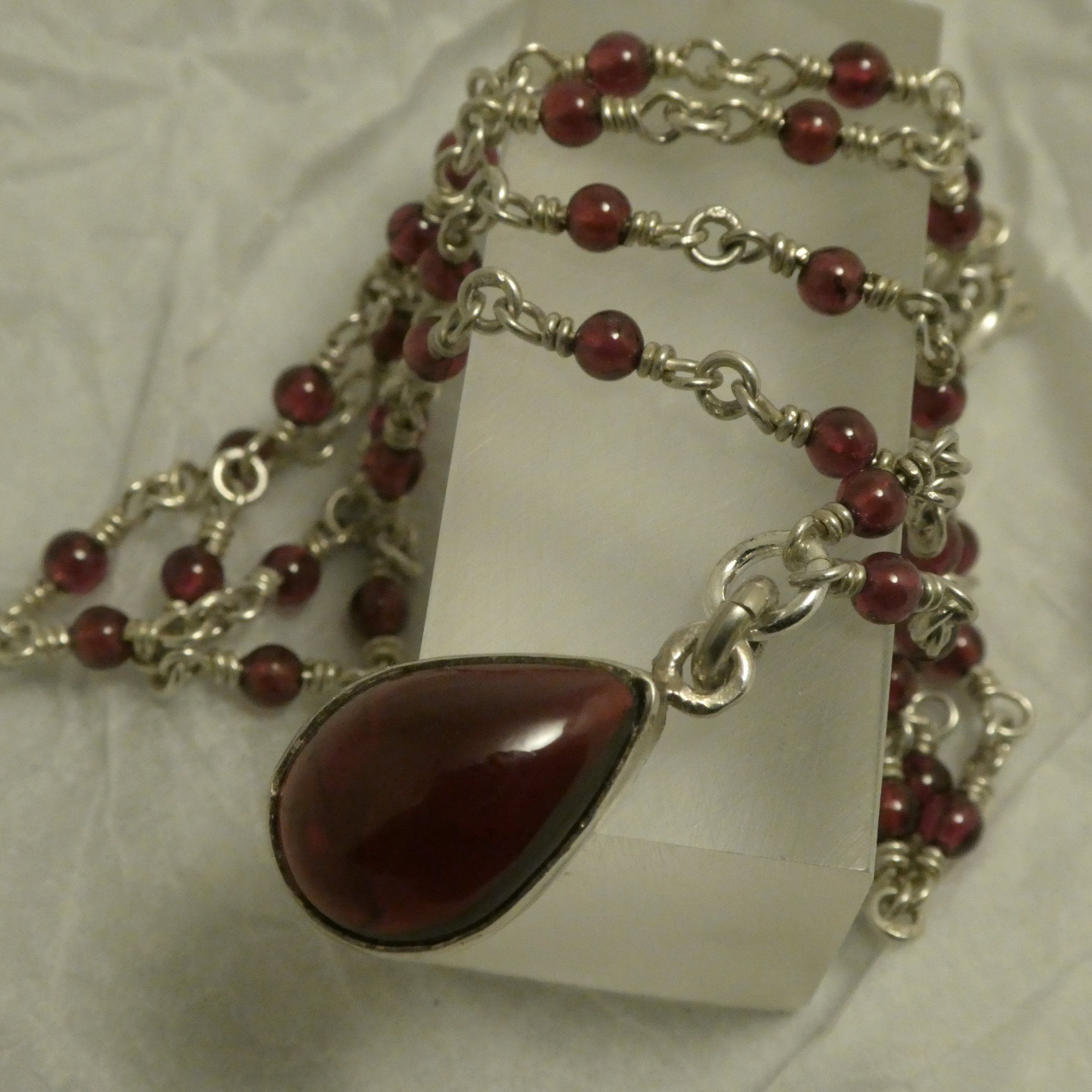 Garnets AGrade wine-red. The forty-two 2.5mm round Garnet beads are of a lovely deep translucent rose` hue, almost a Rhodolite colour, while the teardrop cabochon cut pendant is of a deeper shade of red, of the Almandine variety.