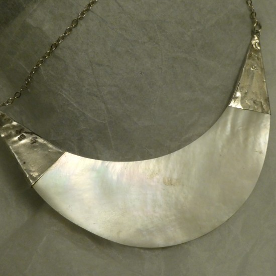 Granulated Silver work in the cappings and centre ornament of a pendant of handcut shimmering polished shell, the centre-piece set with a small Black Onyx; on a Silver chain, simple slim and sturdy.