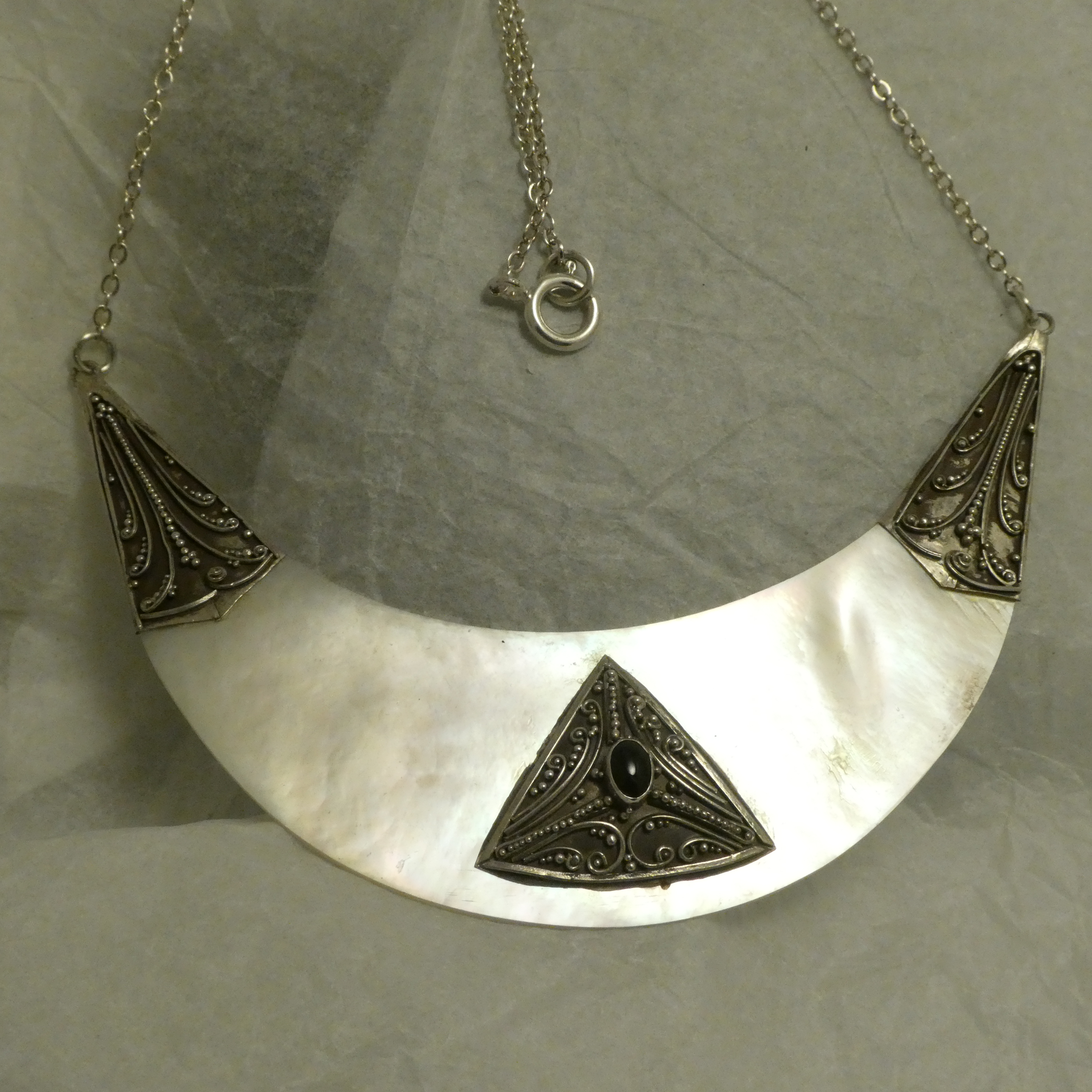 Granulated Silver work in the cappings and centre ornament of a pendant of handcut shimmering polished shell, the centre-piece set with a small Black Onyx; on a Silver chain, simple slim and sturdy.