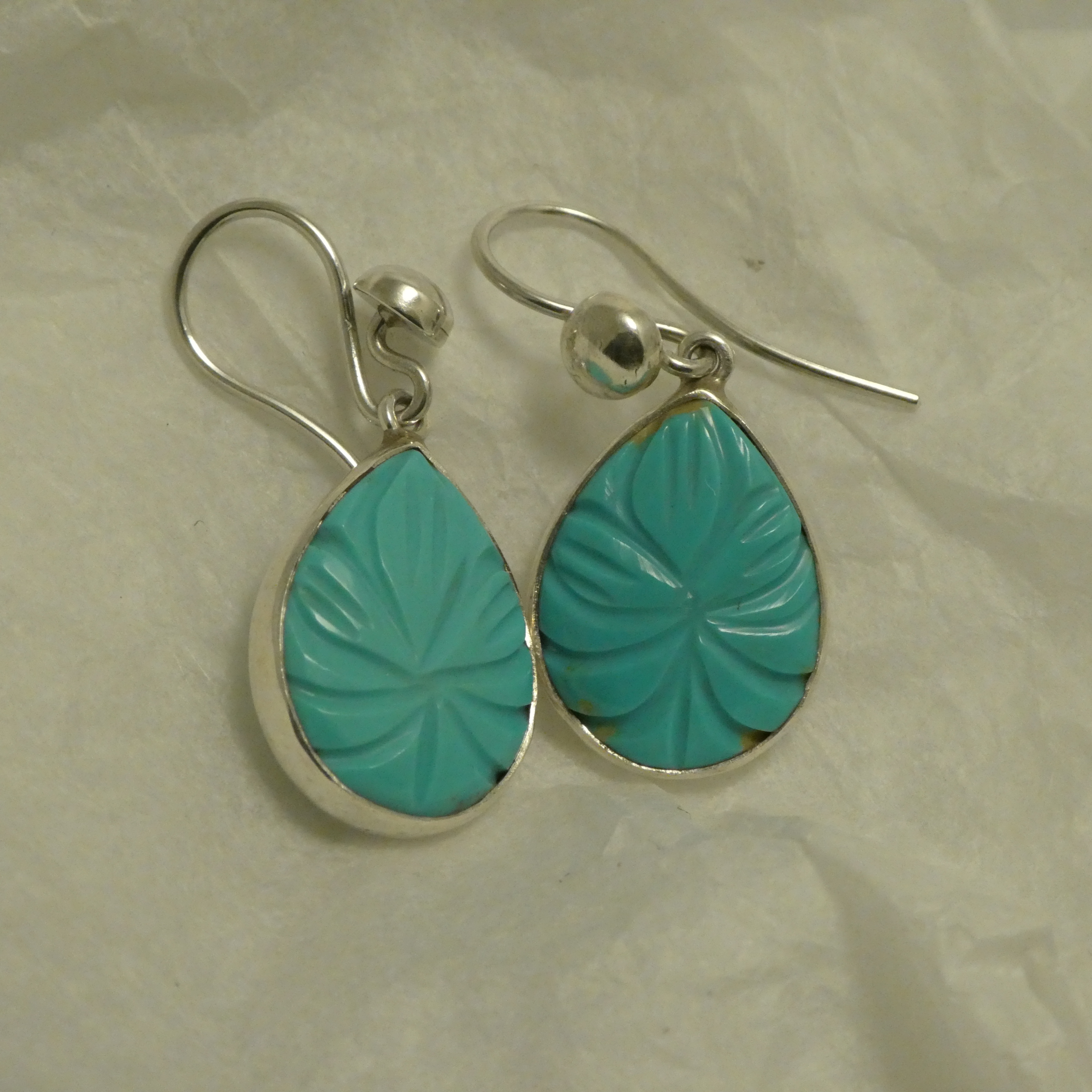Handcarved Turquoise Teardrops, Handmade Silver