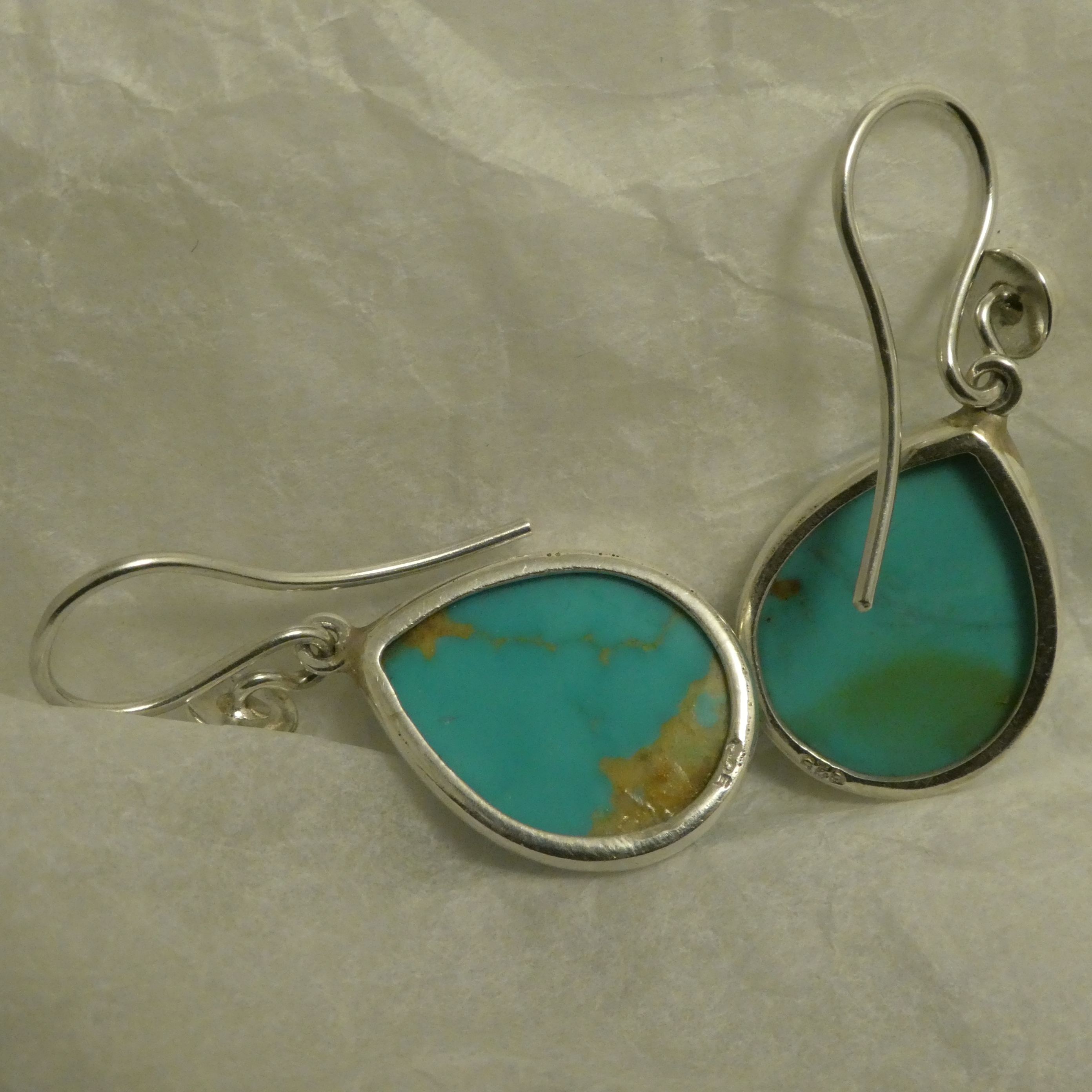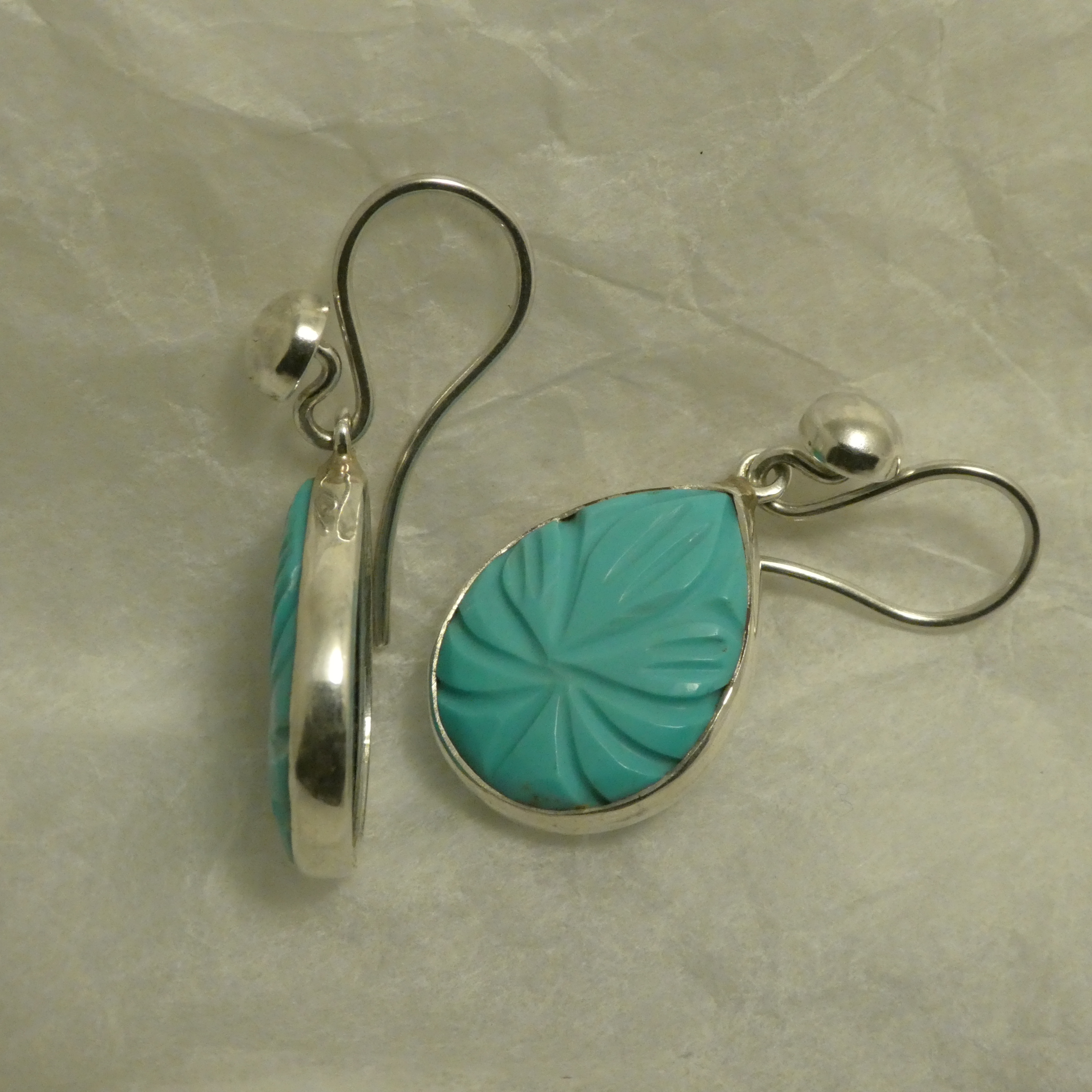 Handcarved Turquoise Teardrops, in bezel settings specifically handcrafted for this pair. The Turquoise pair, already carved, was sourced in Kabul, Afghanistan, and taken to Jaipur, Rajasthan, where the Silver bezel settings were crafted. The Silver earhooks are Sydney made.