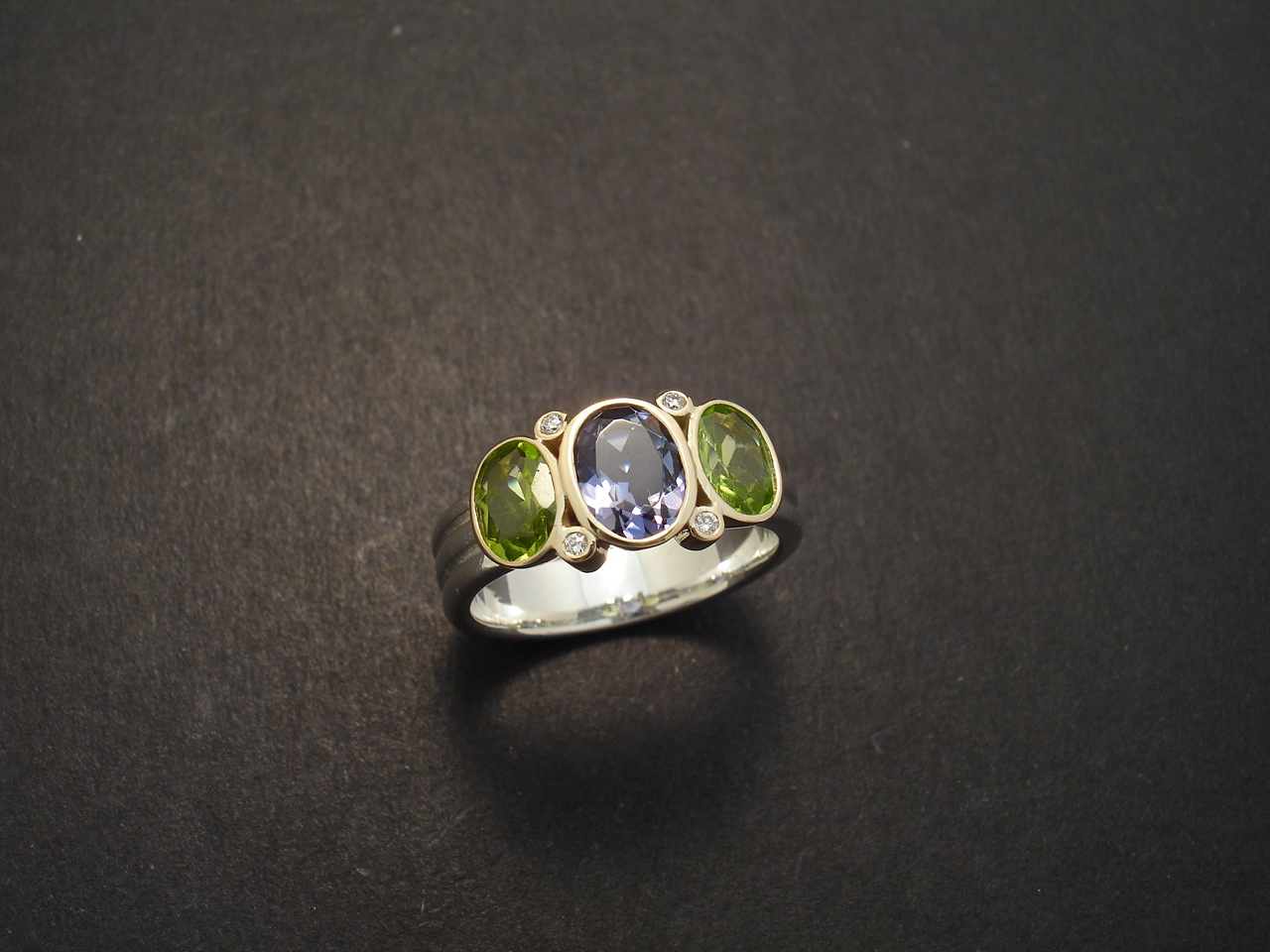 Blue-mauve Iolite 8x6mm oval, flanked by two bright light green Peridot 7x5mm ovals, with highlights of four small White Round Brilliant Diamonds, all seven gemstones in a solid setting of 9ct Gold, on a three-band ring of Sterling Silver.