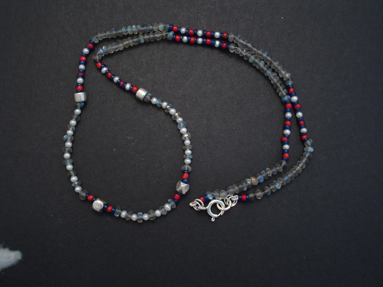 HOLD. Cut Labradorite gemstone beads of fine AGrade glacial green sheen, with 2.5mm matched white Pearls, and small red and dark blue old glass beads from the hilltribes of northern Thailand.