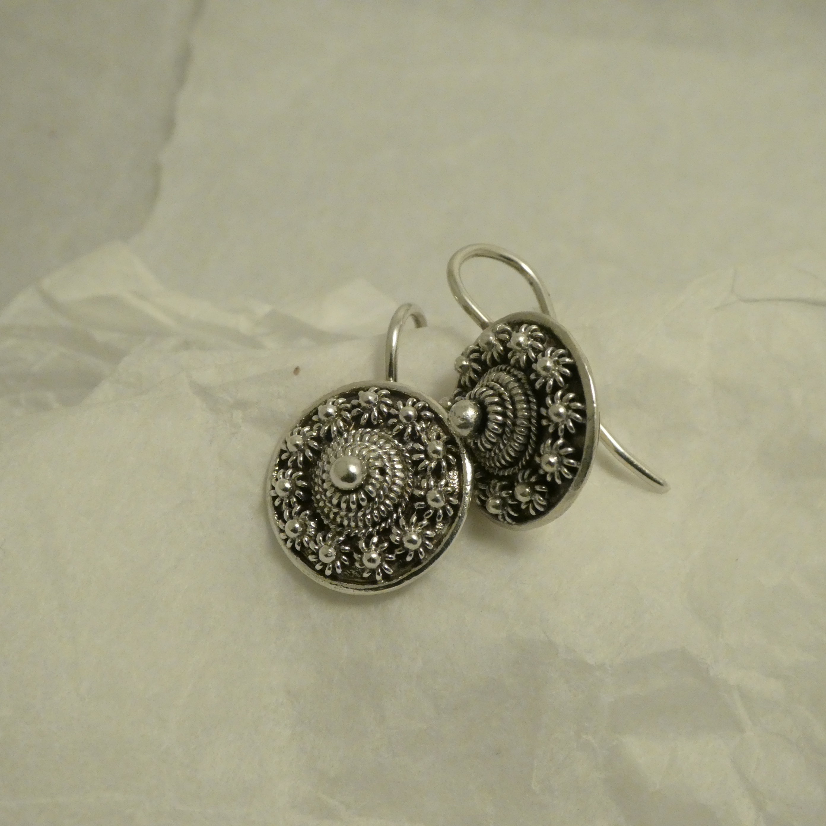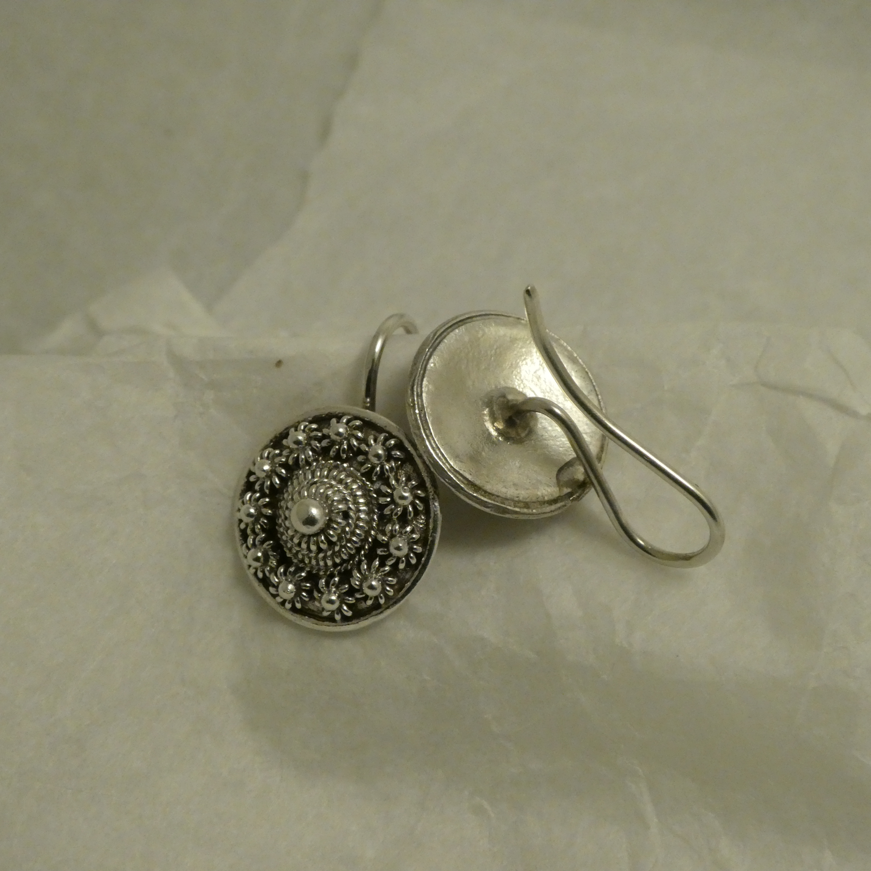 Laos Silver buttons, intricately fashioned in pure Silver in the 1960s/70s, re-created in Sydney as earrings, with elegantly formed earhooks of handmade Sterling Silver.