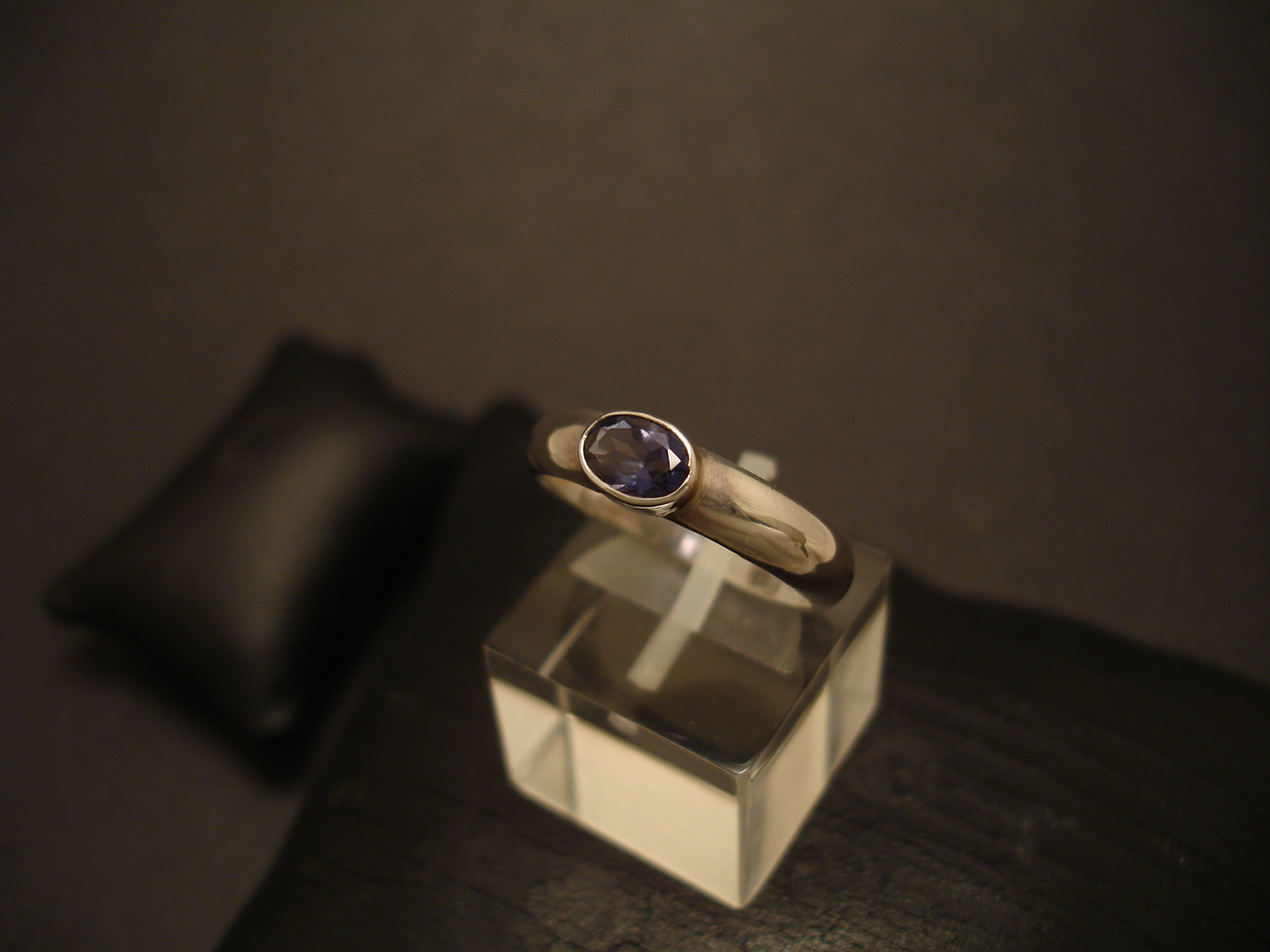Lilac-blue Iolite, dichroic gemstone showing two colours depending on the light source, 6x4mm faceted oval, bezel-set in a simply styled ring handcrafted in Sterling Silver.