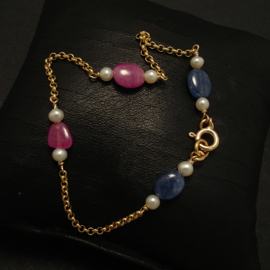 Natural Pebble Sapphire & Ruby, Pearl, 9ct Gold bracelet, created in Sydney, the four segments of gemstones incorporated with hand-worked 9ct Gold wire-work, the 9ct Gold round wire of 0.5mm thickness.