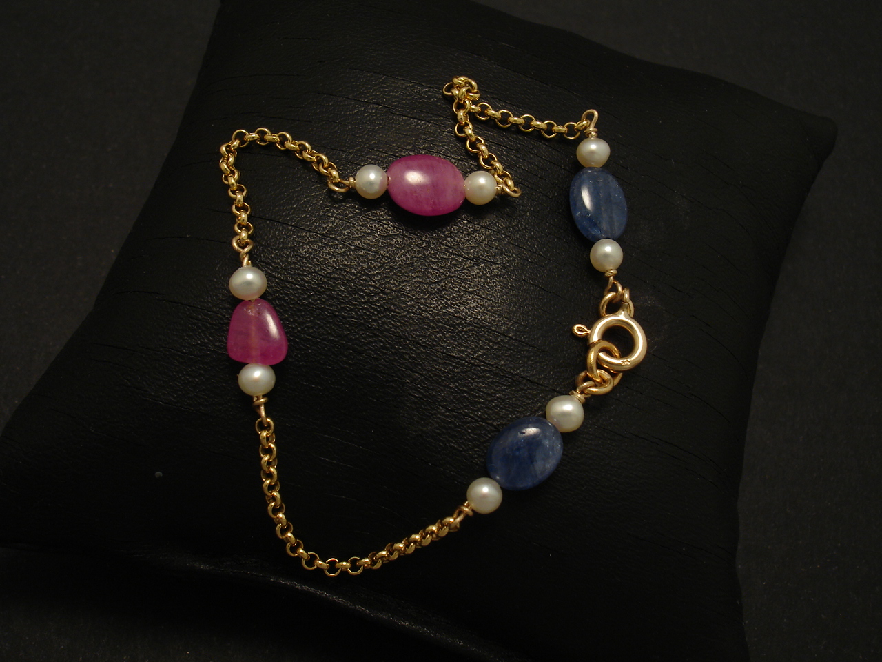 Natural Pebble Sapphire & Ruby, Pearl, 9ct Gold bracelet, created in Sydney, the four segments of gemstones incorporated with hand-worked 9ct Gold wire-work, the 9ct Gold round wire of 0.5mm thickness.