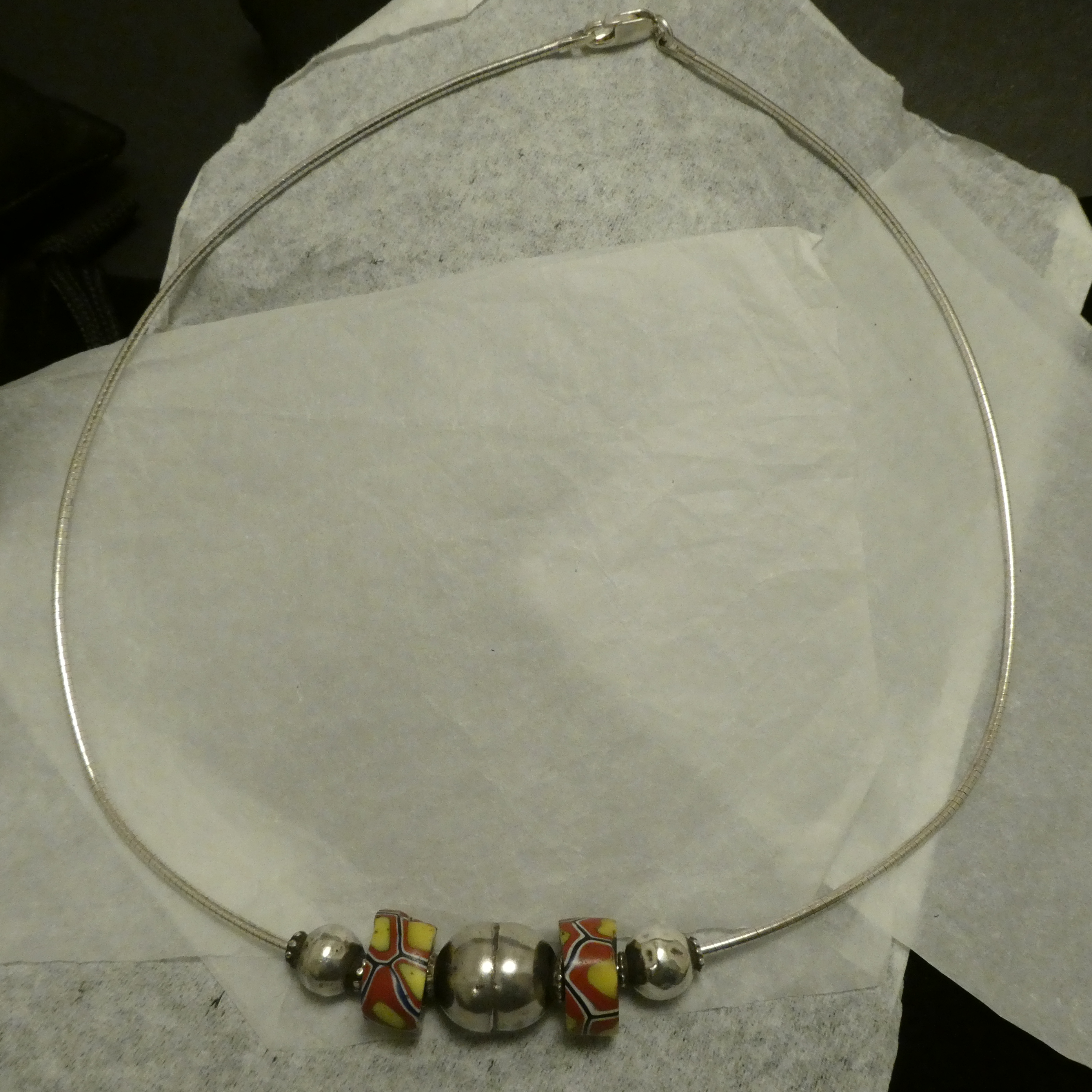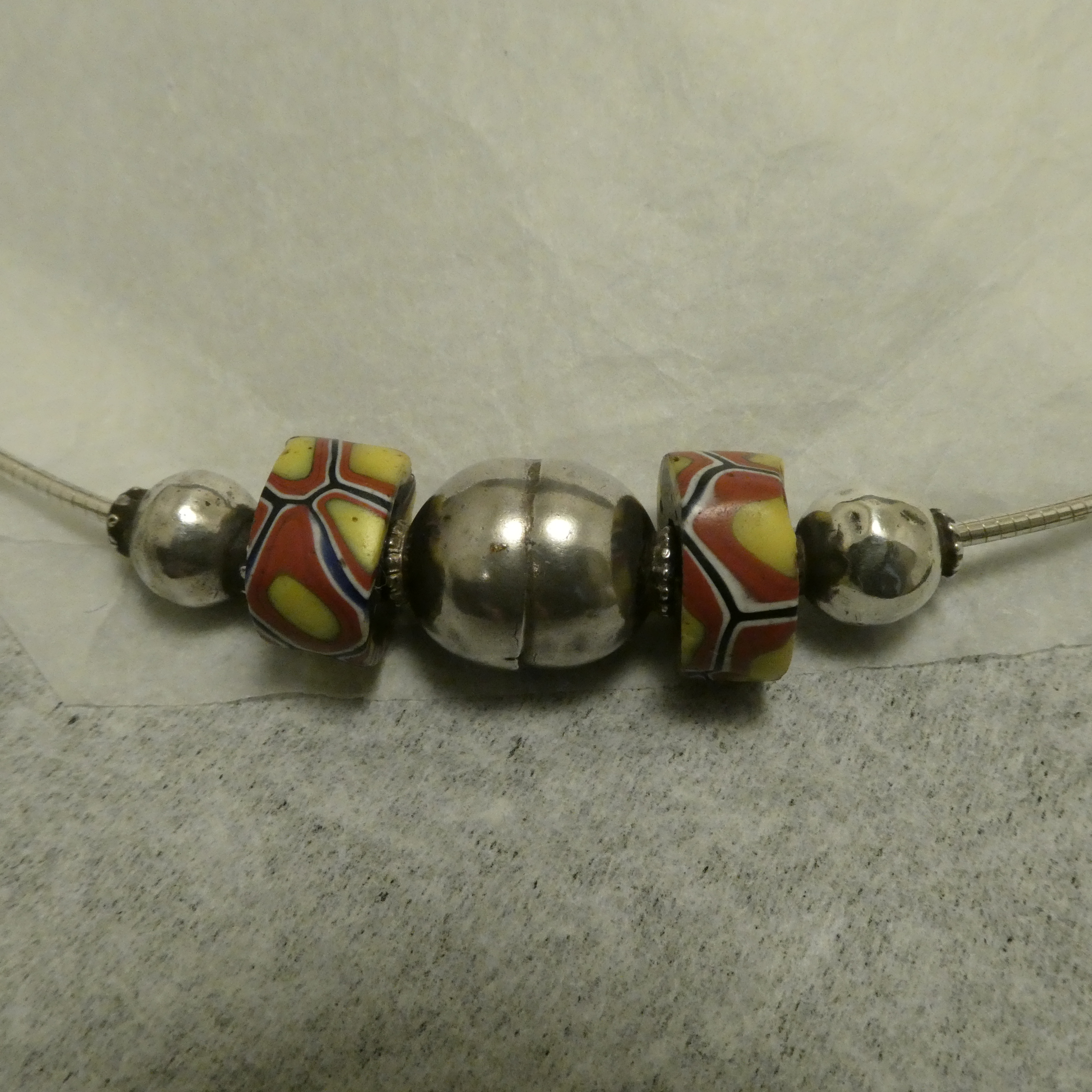 Old Silver & Venetian Glass. The old Silver beads, centre bead Turkmeni and the two outside beads Afghani, totally handmade, date from around the mid-1900s; the two old glass beads, coloured on a black core, are over a half-century older, hand-blown on an island in the Venice Lagoon in the late 1800s. Countless numbers of such glass beads were created in Venetian work shops specifically for the bartering trade that flourished in the 1800s between European and African traders. These glass beads were traded into all parts of the African continent.