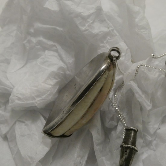 Along with umpteen other such items deemed superfluous by the shoots of the princely families -after a newly-formed national government, ushered in through the Partition of India and the end of the British Raj, moved to curtail their power and privilege- such as Silver items by the hundred-weights, and fantastic hand-carved wooden artefacts, the above nicely handcarved Ivory piece found its way to Delhi. The Silver-work transforming it into a pendant was done in the 1970s, in Pahar Ganj, New Delhi.