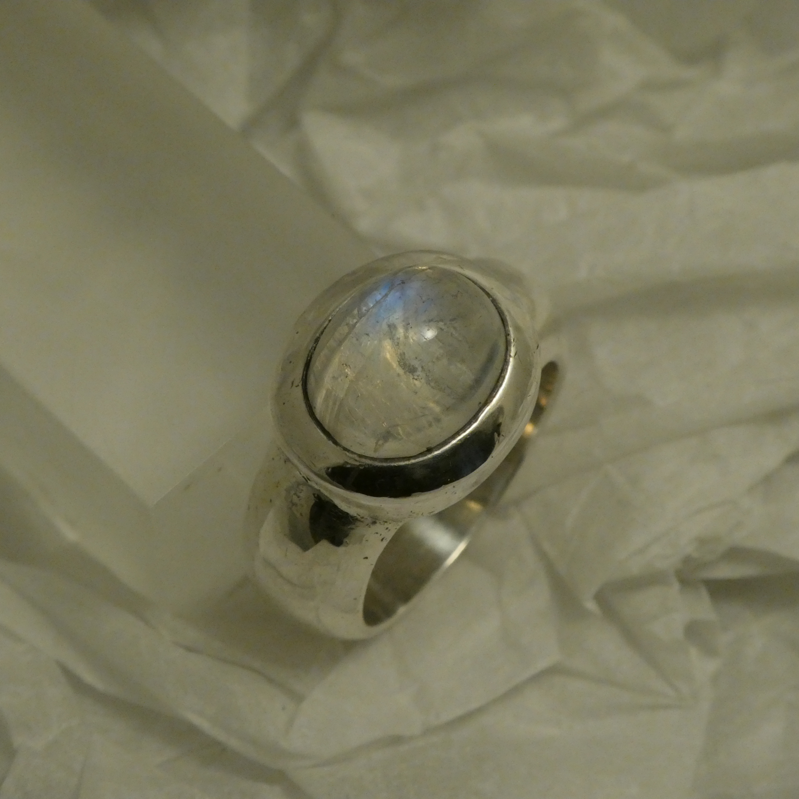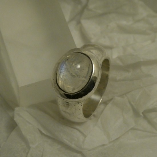 The most commonly found Labradorite is opaque, with greens and purples and blues, the colours shimmering vividly, especially when polished, in an iridescent effect called labradorescence. This type of more commonly found Labradorite is more an “ornamental” gemstone and is rarely used in jewellery. The “Blue Moonstone” type of the above Oval Labradorite, however, has often used been in rings and pendants of Silver since the early 1900s.