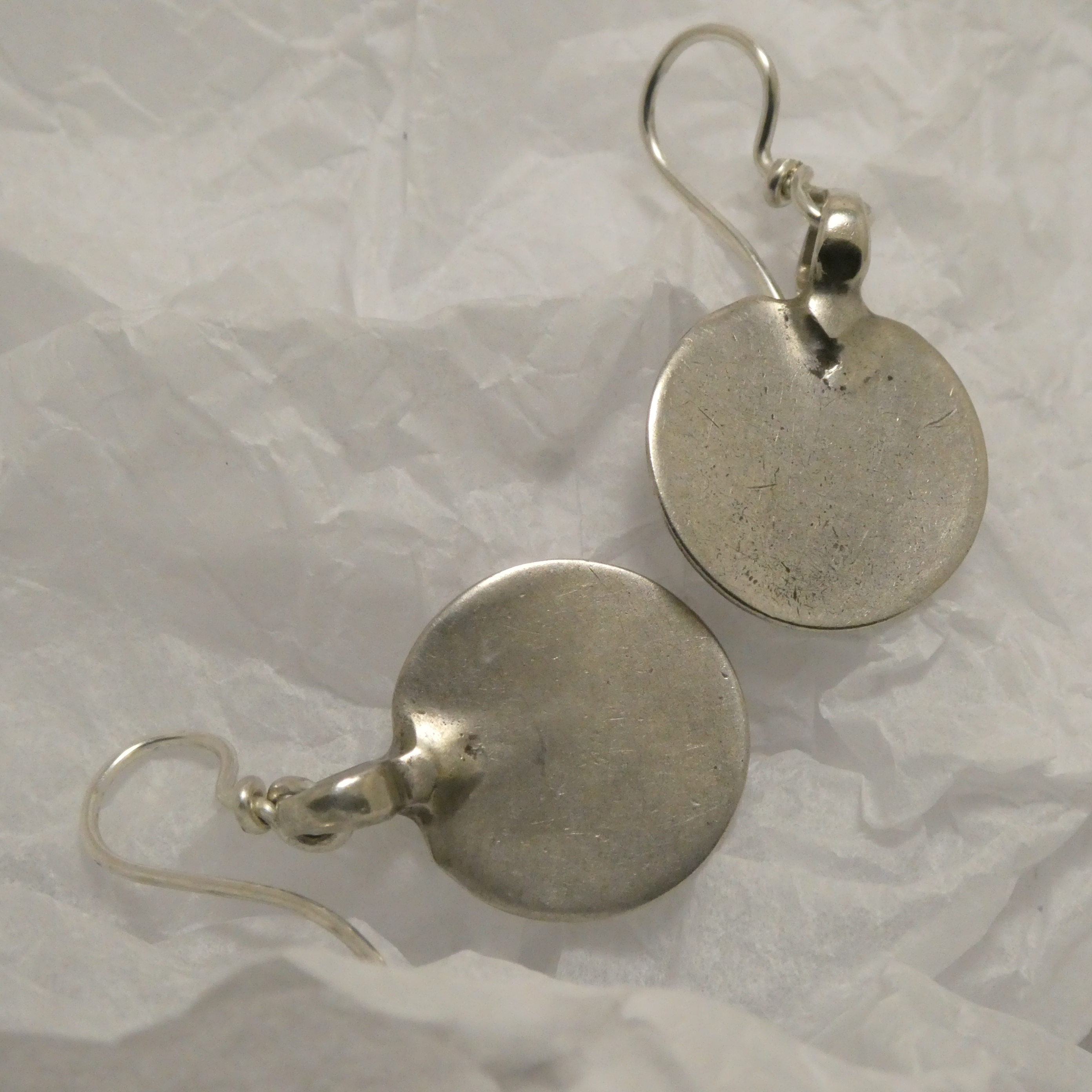 Plain Silver Tribal Disc earrings. From the Himachel Pradesh region of north-west India, right up in the hills, in the Himalayan foothills. For all sorts of reasons, the region has a reputation for being progressive, and is definitely relatively well-off; certainly the hand-worked Silver out of that area is always nicely crafted and of high Silver content.