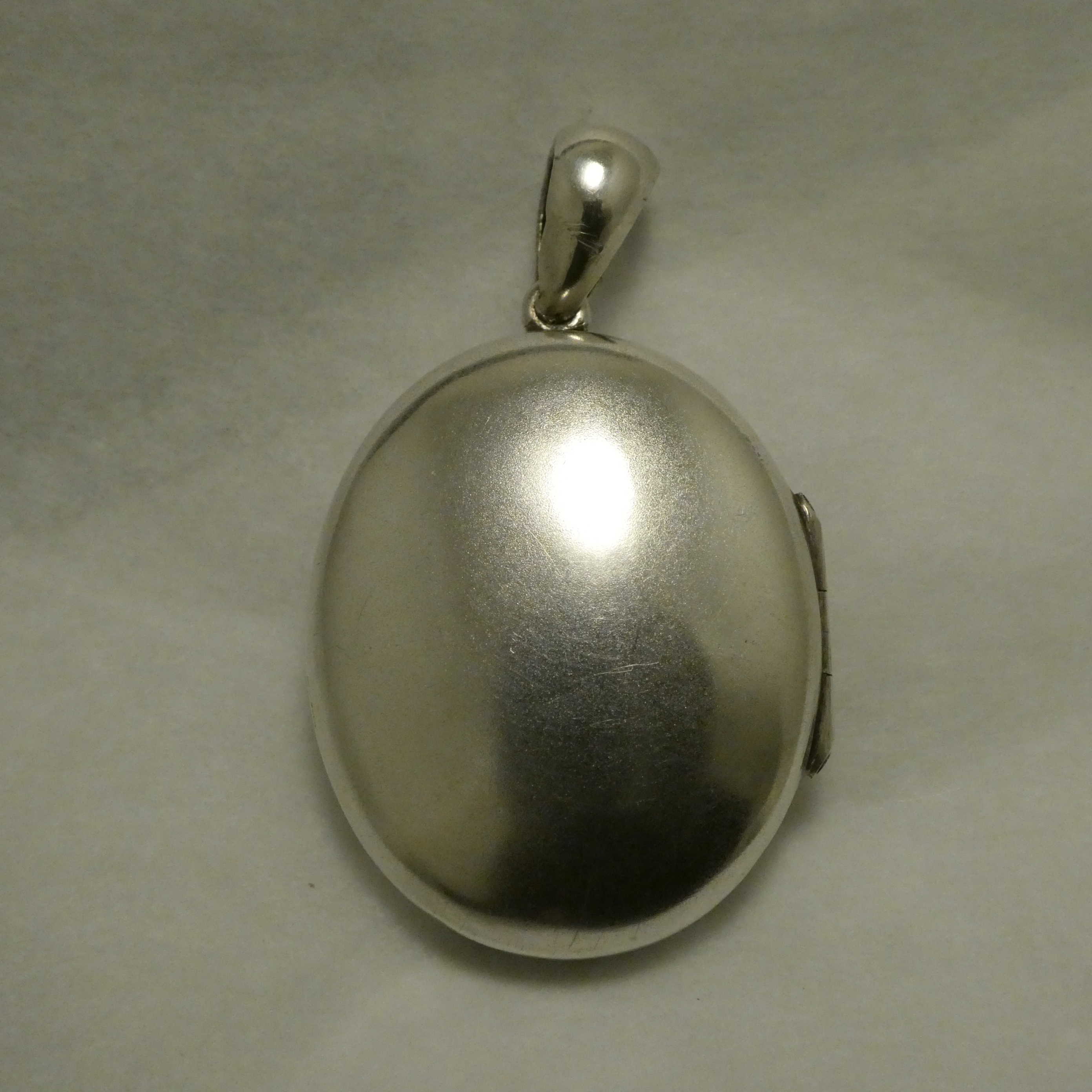 Plain Antique English Silver locket, hallmarked in Birmingham in the year 1892, of a neat oval size smaller than most of this form, 30x25mm x 10mm depth, total pendant length with its typically tapered and domed bale, 40mm.