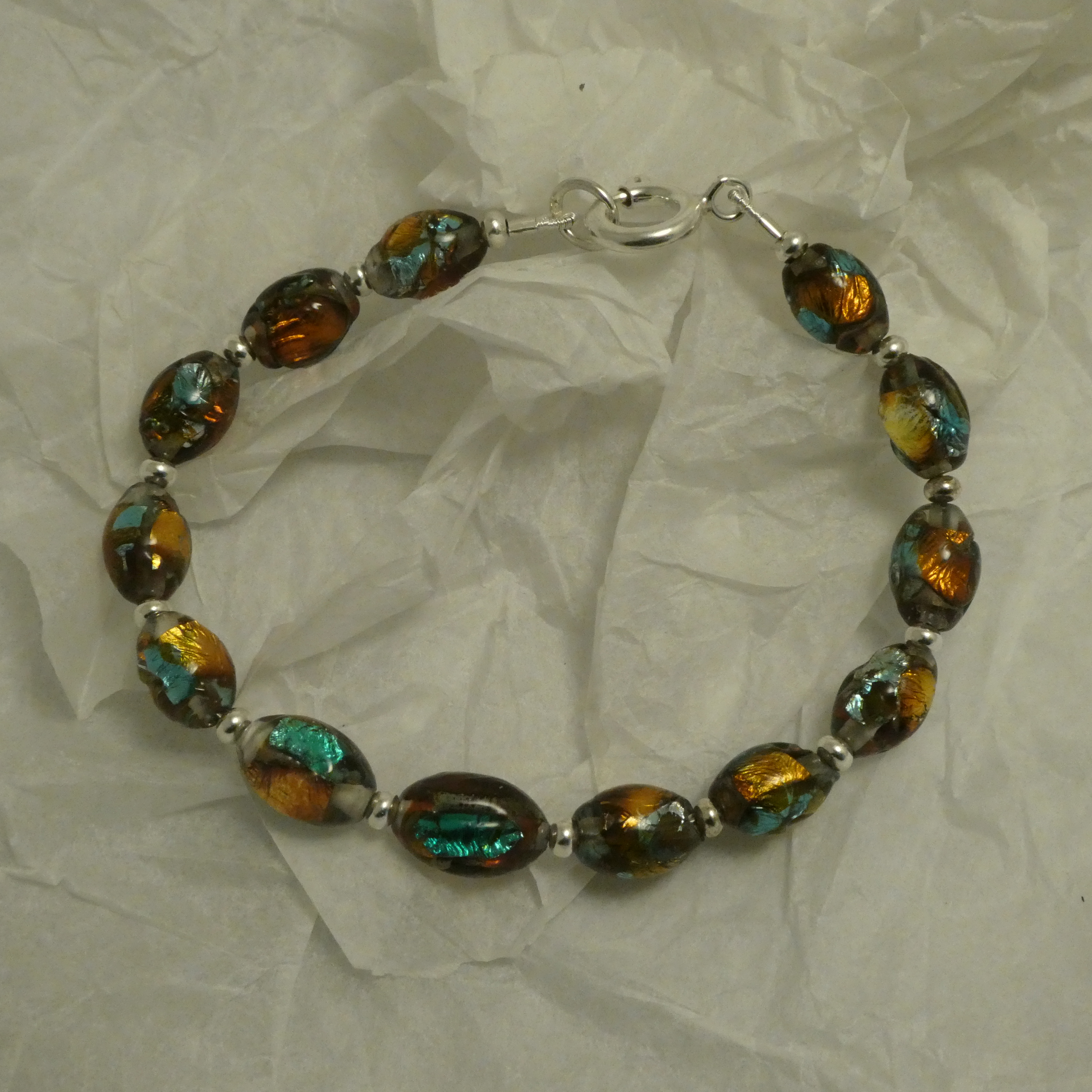 Scintillant Venetian glass bead bracelet, beads of coloured foil-included handblown glass produced on Murano sometime around the late 1800s, early 1900s.