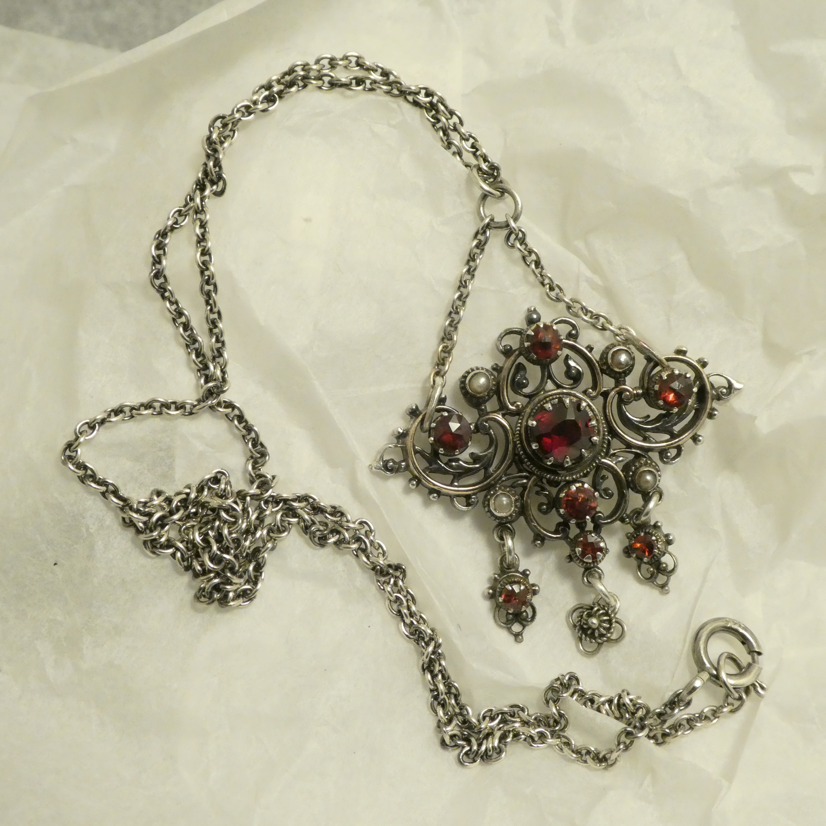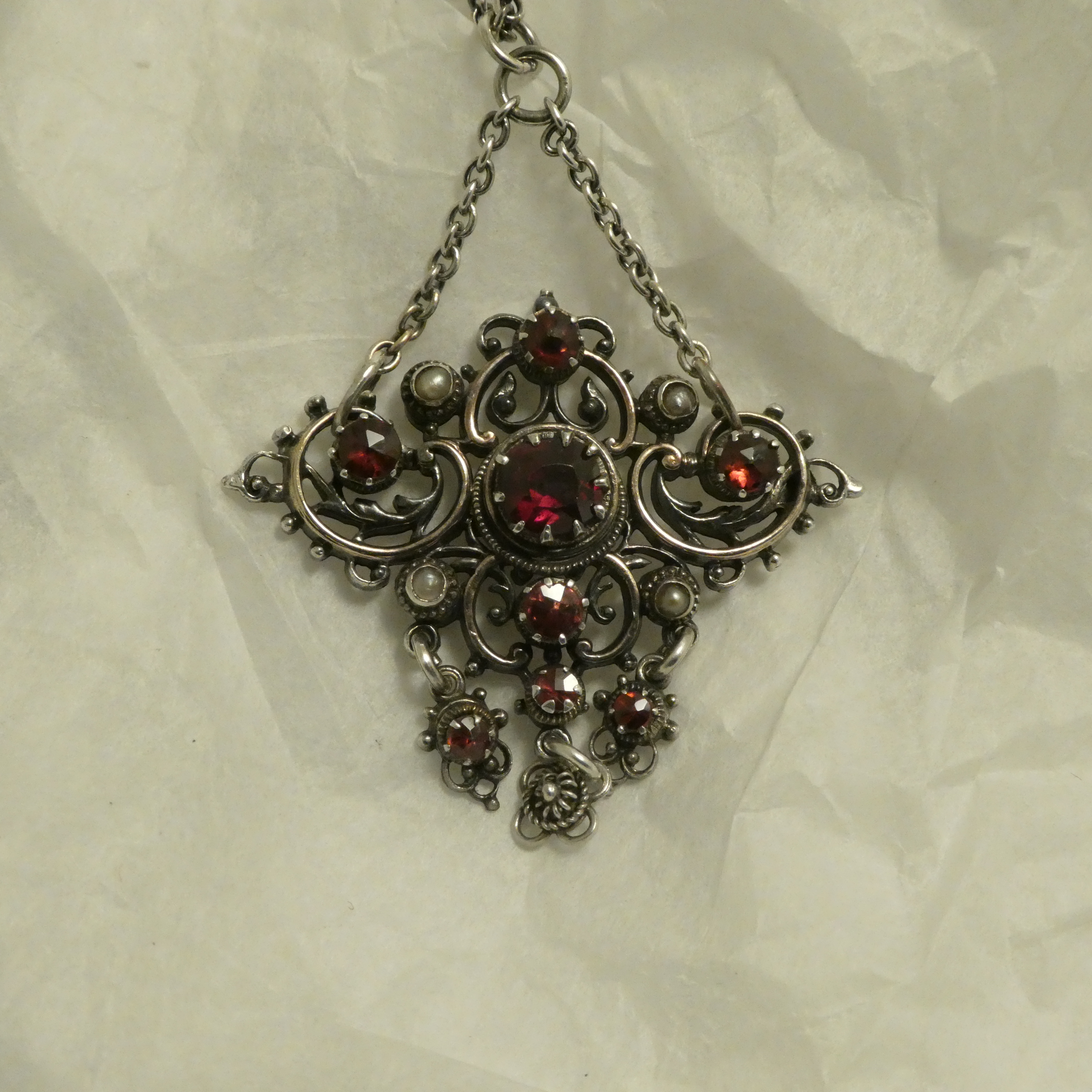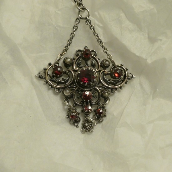 SOLD. Seven Bohemian Garnets of characteristic vivid red, with four small natural Bahrain Pearls, in a pendant finely handcrafted in Silver in Vienna or some other Austro-Hungarian city pre-1914.