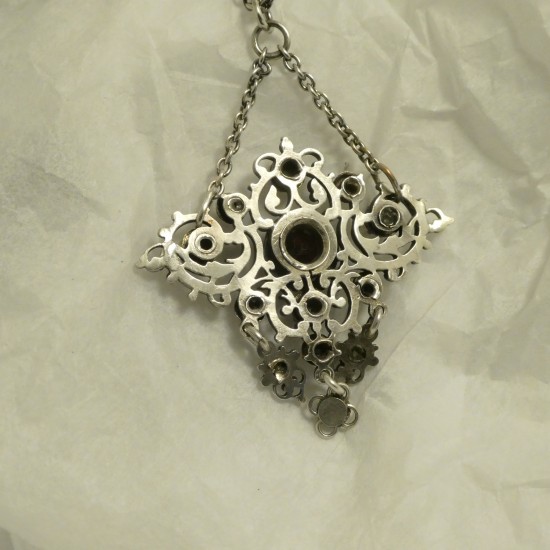 Pendant 32mm long, 35mm wide; Silver chain 46cms length, with the two extra small lengths of Silver chain and the pendant itself adding a further 45mm. (Silver chain is new, added in Sydney to the pendant.)