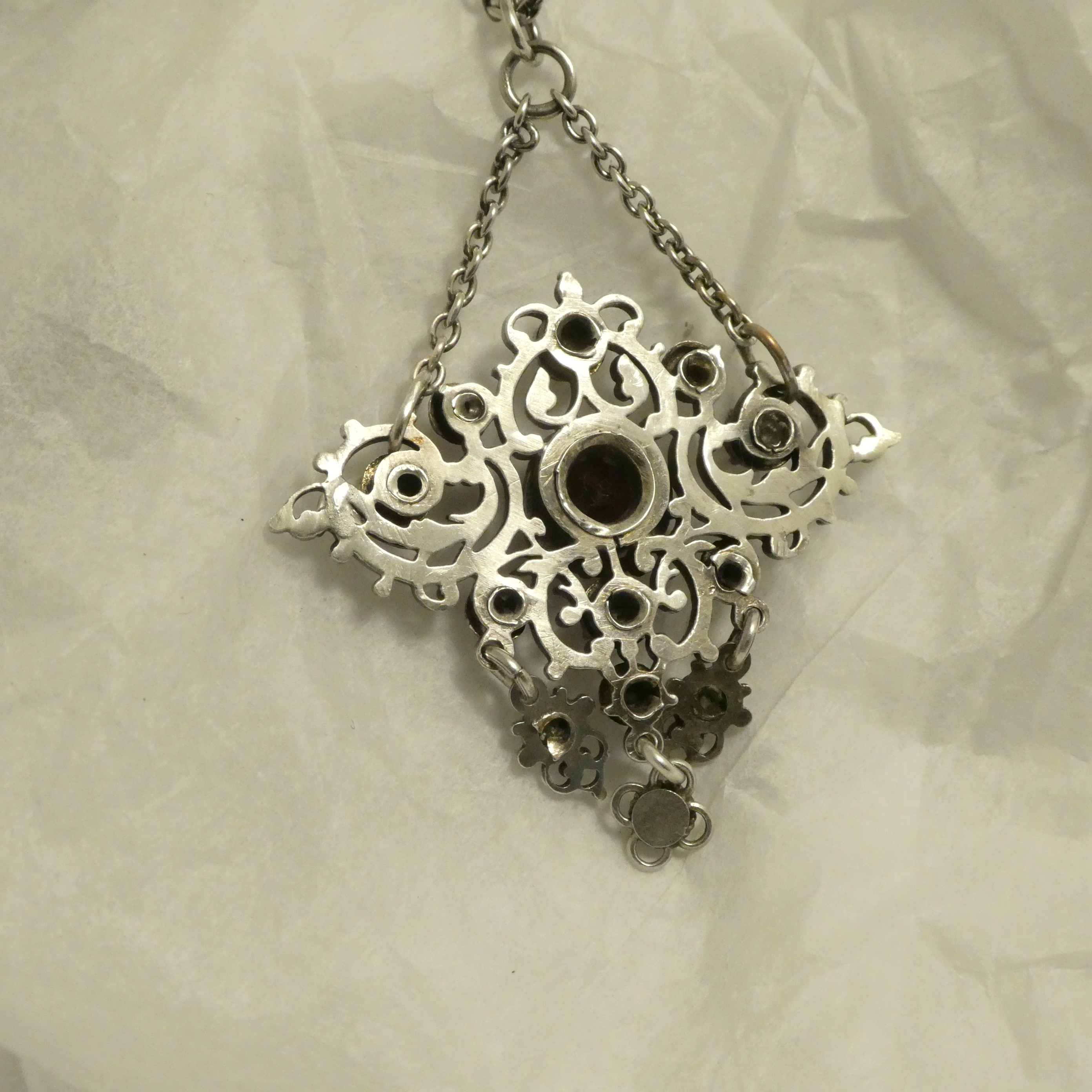 Seven Bohemian Garnets in an Antique Silver pendant handmade in the late 1800s, early 1900s, created in Vienna or in one of its satellite cities in the pre-1914 world of the Austro-Hungarian Empire. The Podvedice region of Bohemia, in Czechoslovakia, was Europe’s source of the red Garnets such as the Seven Bohemian gemstones above, and Bohemia, just north of present-day Austria, was firmly integrated into the Austro-Hungarian Empire.