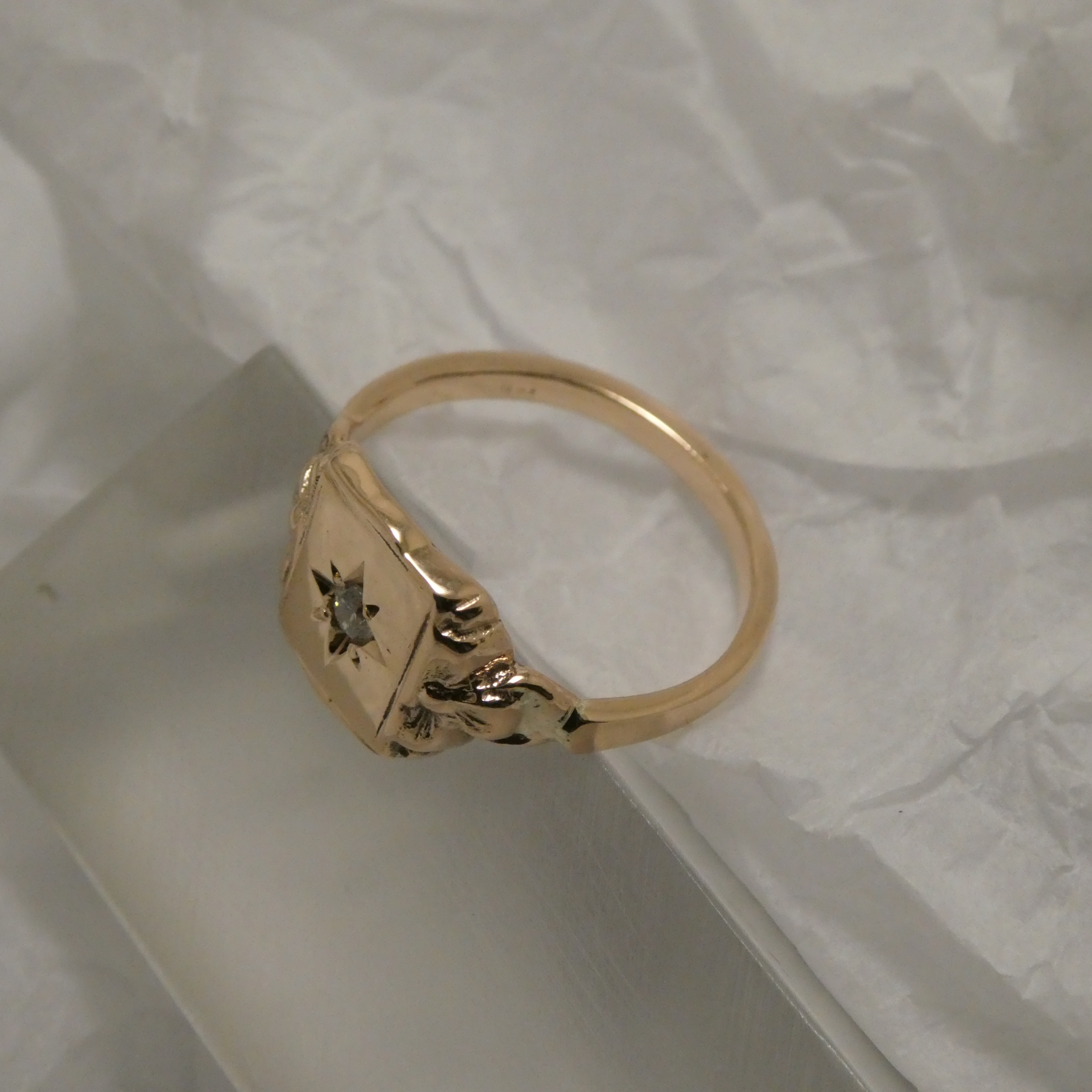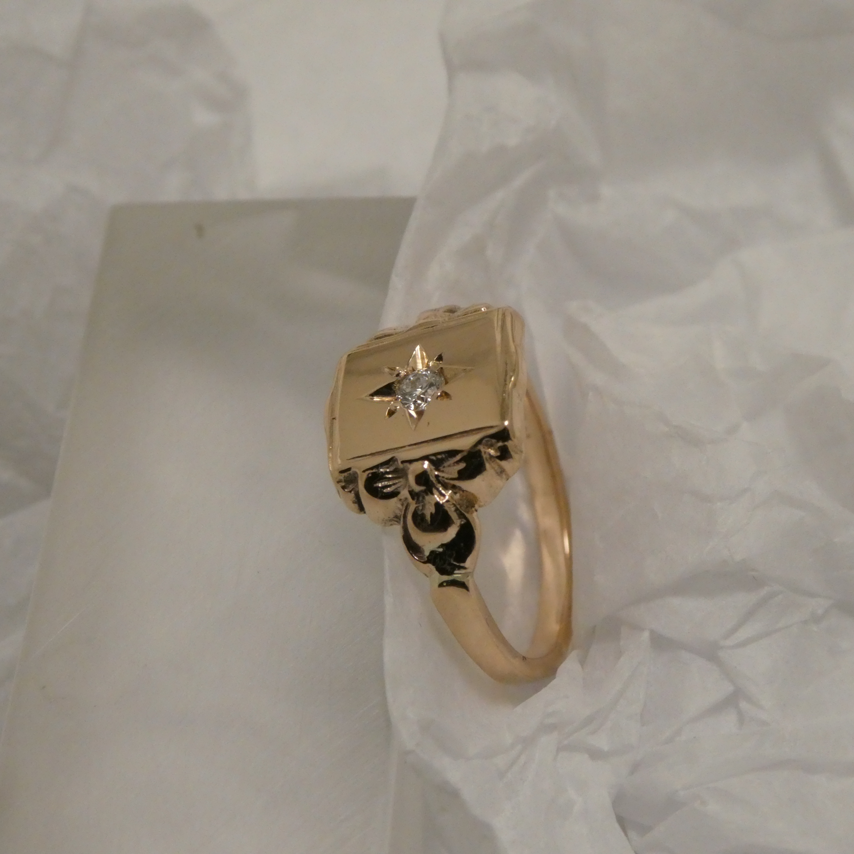 Signet Ring created in Sydney in solid 9ct Rose Gold, design taken from an original Victorian English ring design, bead-set with 5pt White Brilliant Cut Diamond (G/H colour, SI clarity), the bead setting framed within a “star” neatly incised into the Gold by the Sydney master gemstone setter.
