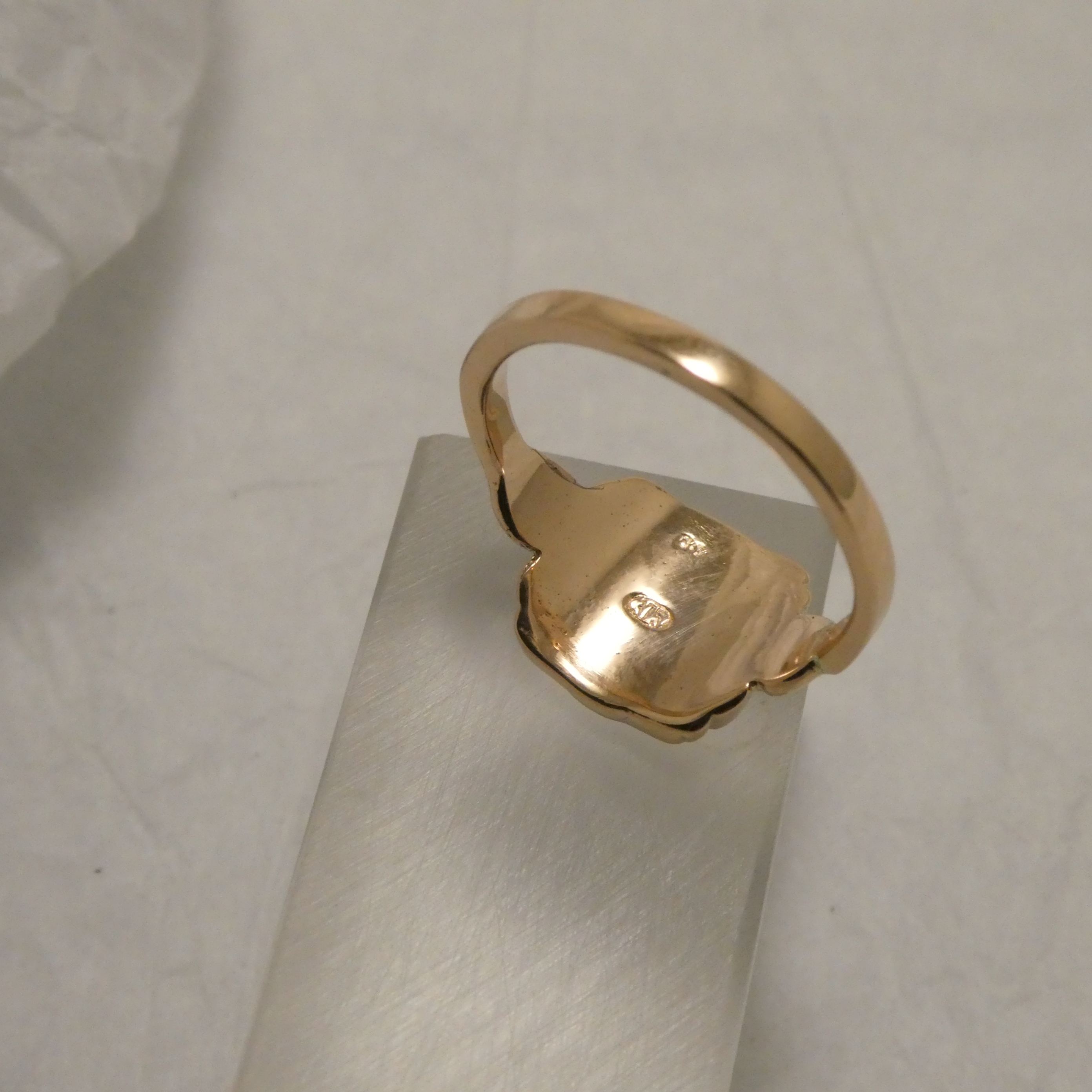 Signet Ring crafted in Sydney in solid 9ct Rose Gold, the design taken from an original late Victorian English Signet Ring, also in 9ct Rose Gold and of the same sort of solid thickness in the top engraving surface, but the band considerably less robust than that of the above ring, indeed bent quite out of shape. The original top rectangular surface was ornately engraved with initials.