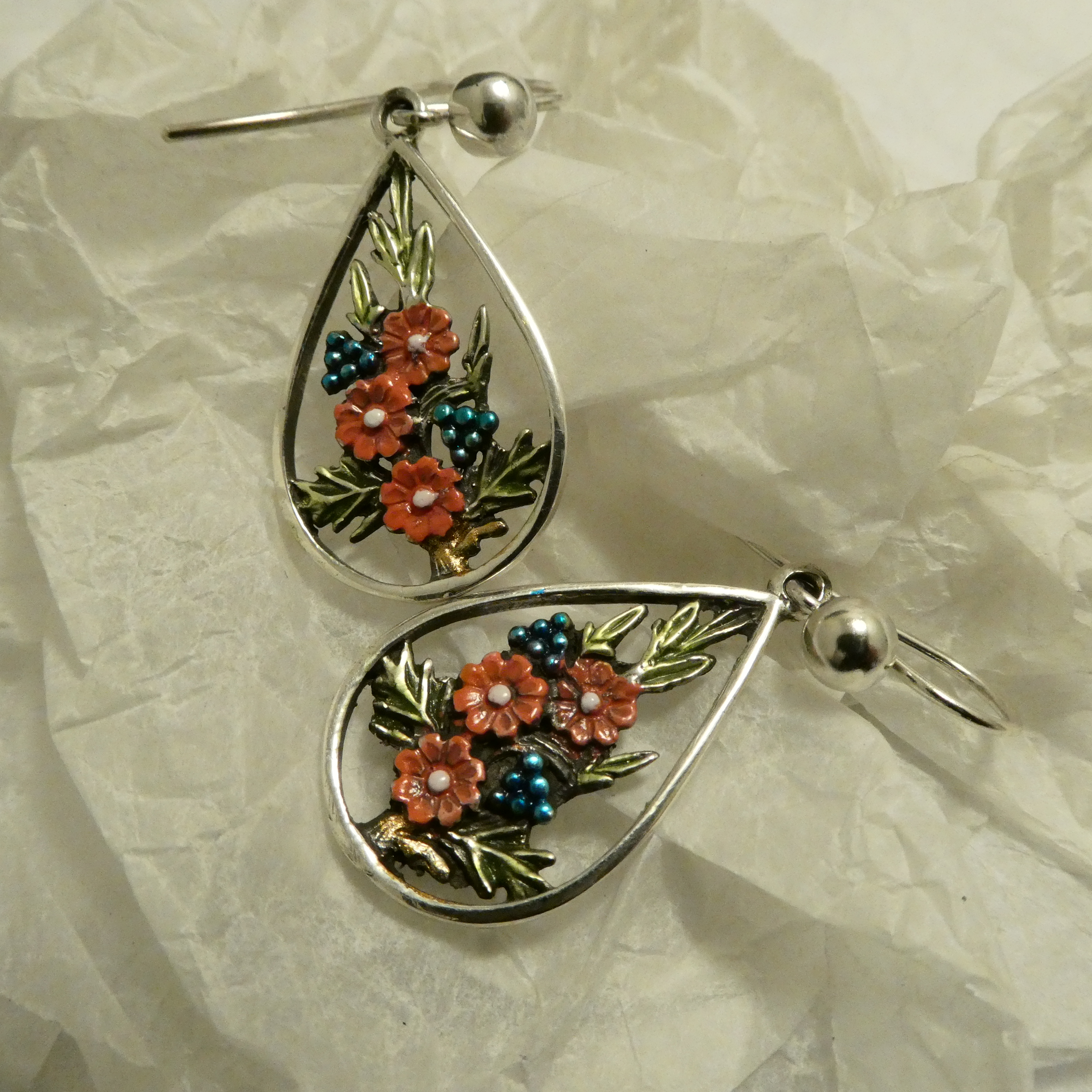 Silver Floral earrings, finely detailed and defined, hand painted in intense colours then kiln-fired.
