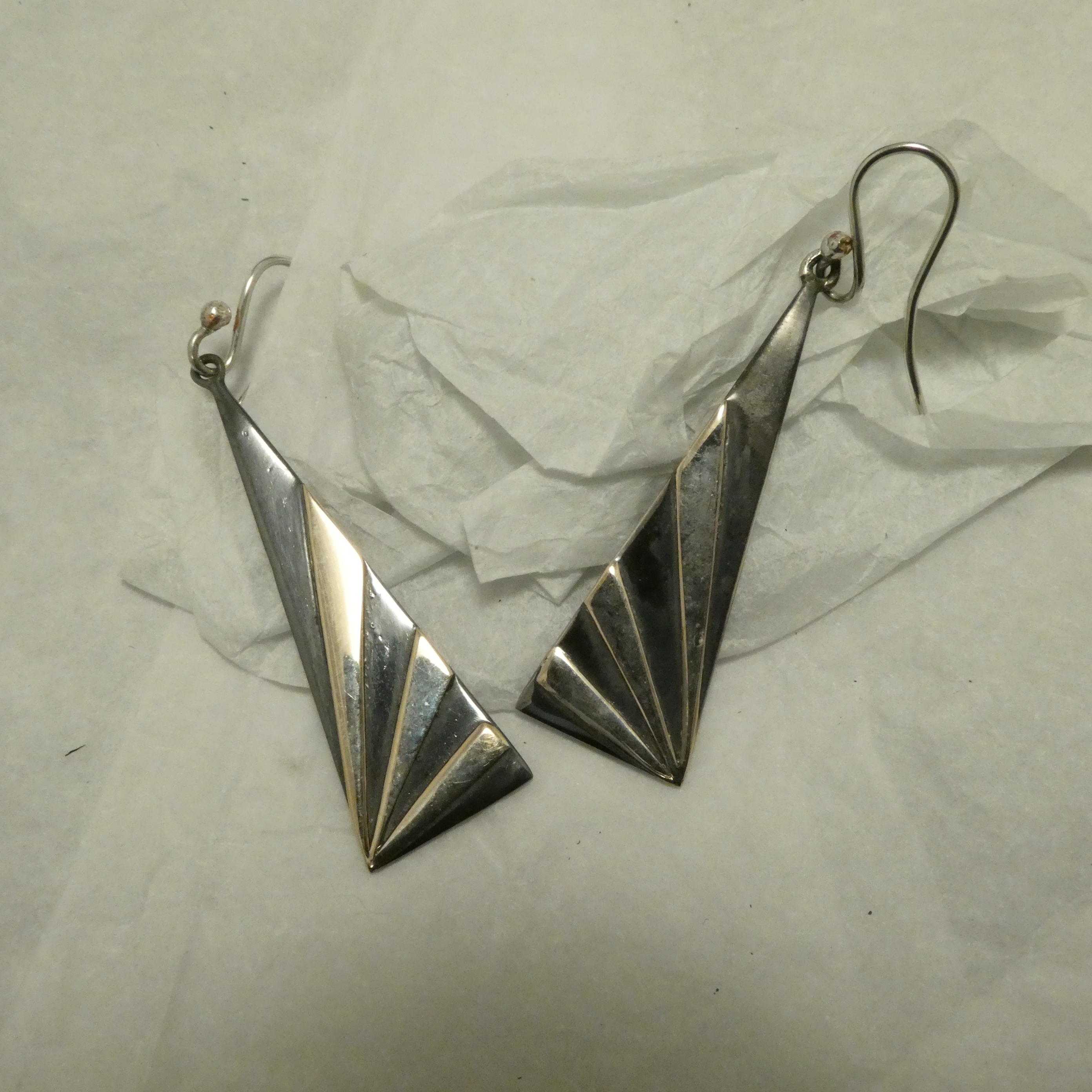 Silver heavily oxidized to black, overlaid with strips of 9ct Gold, a smart sharp elongated triangular form of earrings, earhooks simple handmade Silver.