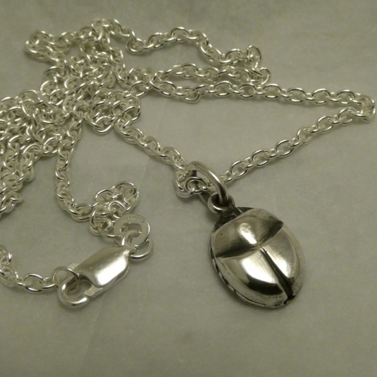 Silver Scarab pendant, neat and solid; on reverse the sacred symbol of the orb of Ra, the Sun God, riding across the sky.