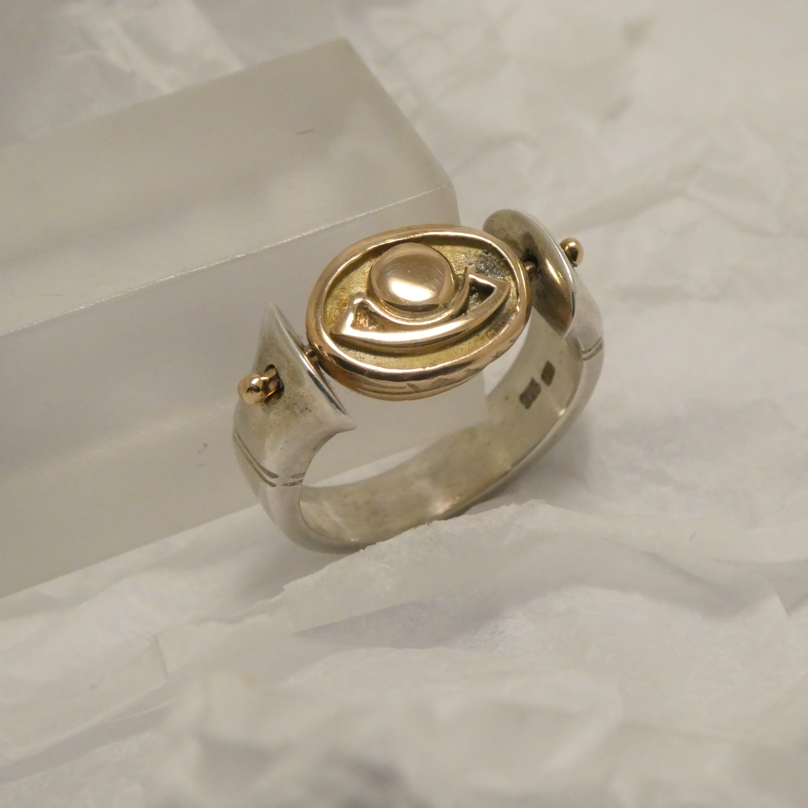 The Gold Scarab is completely solid; 4.5 grams of 9ct Gold has been used in the creation of this Silver Swivel ring, and is by far the largest cost component involved.