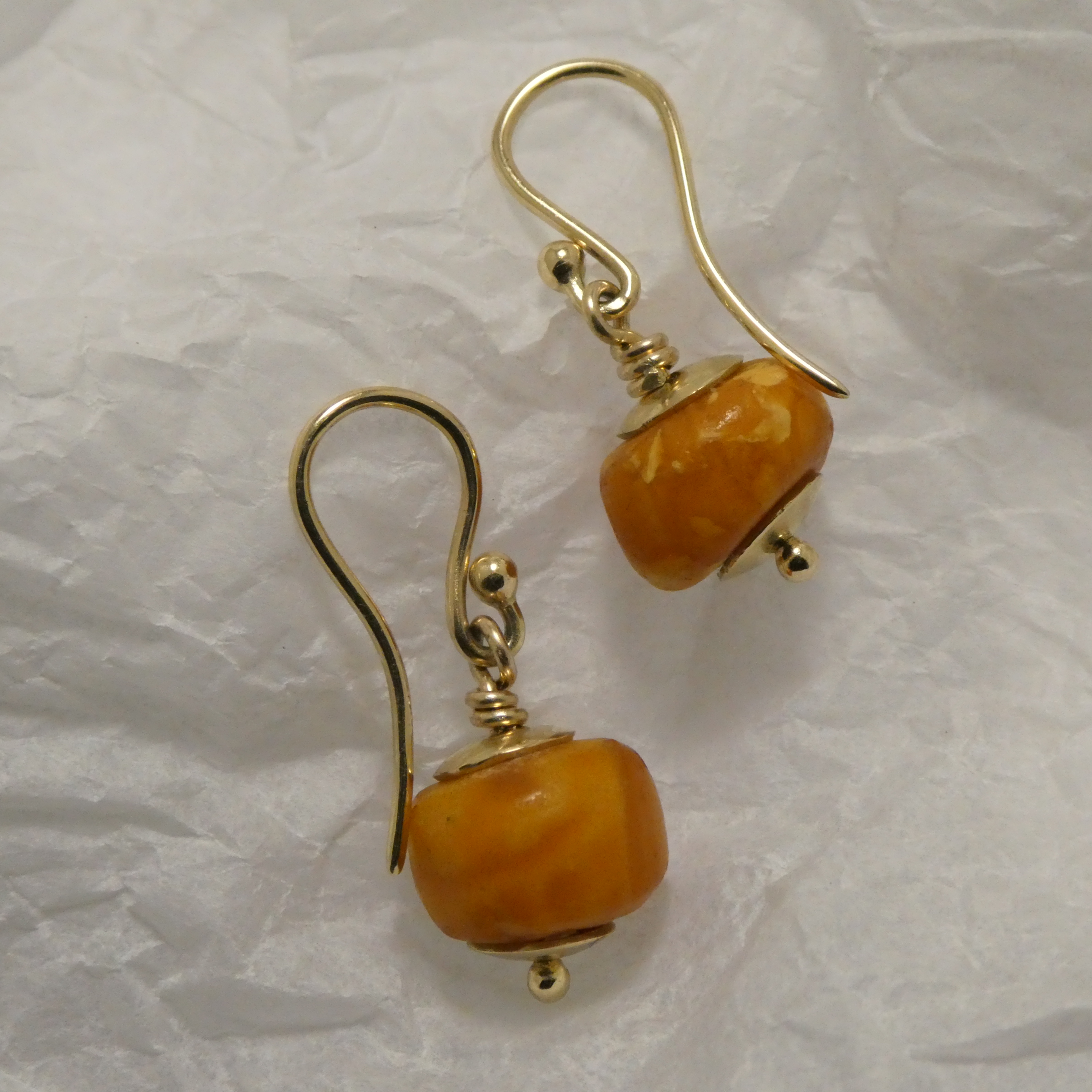 Small Amber pair, old handcut Tibetan yellow, or “butterscotch” Amber, nicely matched, originally from the Baltic Sea of Northern Europe, in lovely little earrings of 9ct Gold, all created and handcrafted in Sydney. (A large component of the cost of these earrings is in the 1.58 grams of 9ct Gold used.)