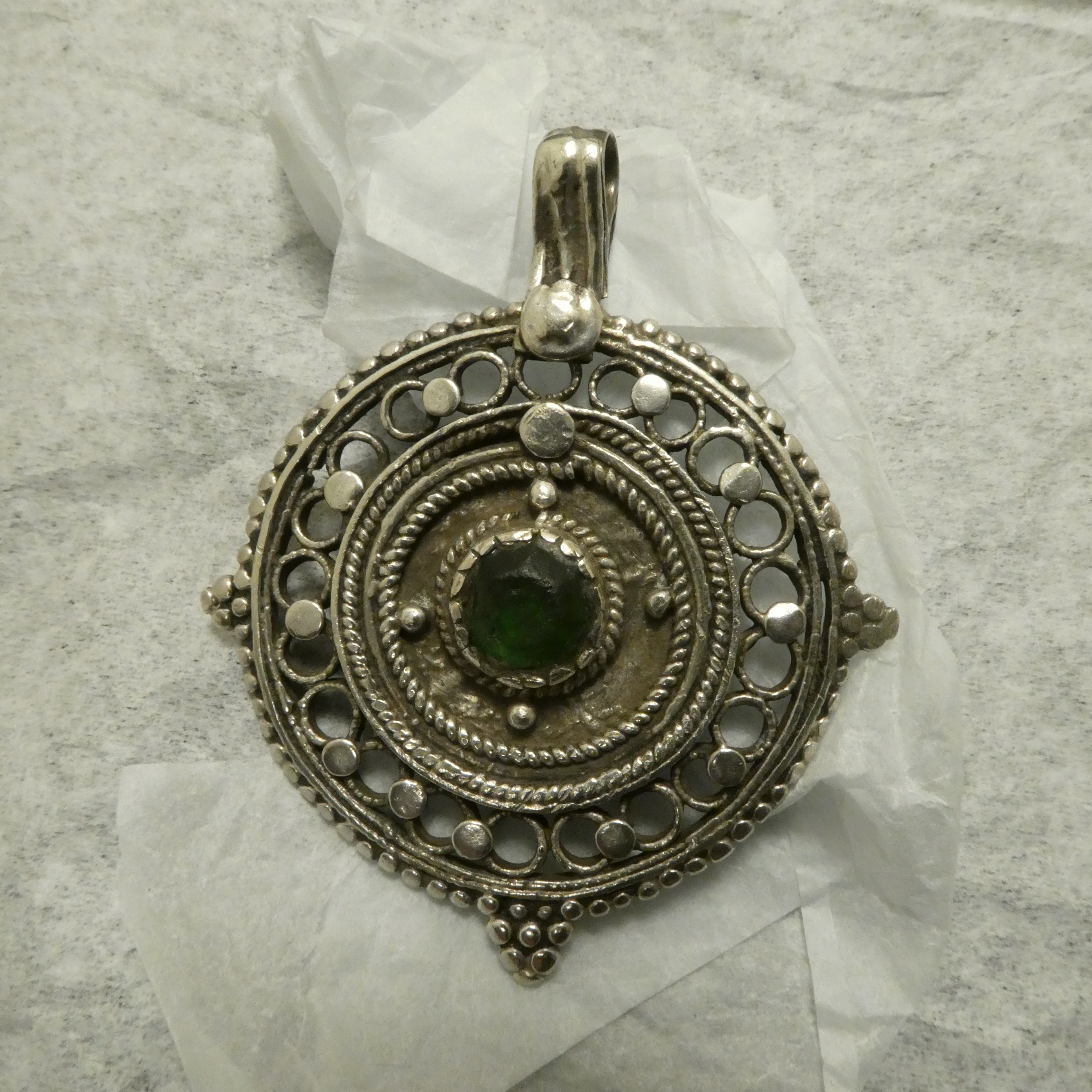 Southern Afghani old Tribal Silver pendant, completely handcrafted around a Silver Persian rial coin of the early 1900s and set with cut glass of deep green.