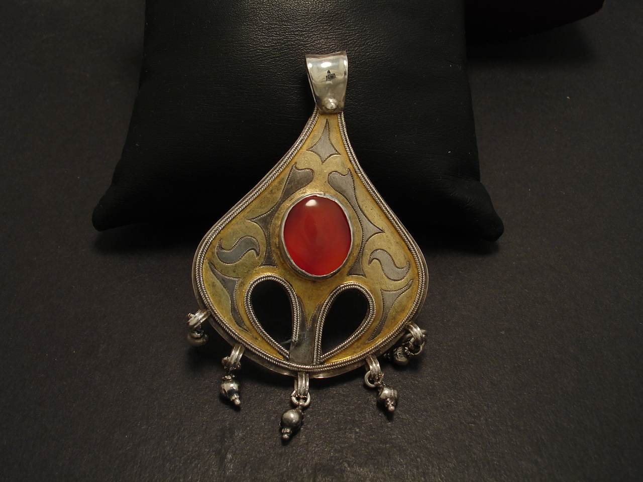 Tribal Turkmenistan Silver and gold-gilt pendant, an old piece with a new bale handmade for it in Sydney, typically set with Cornelian, the favourite gemstone of the 'stan regions.