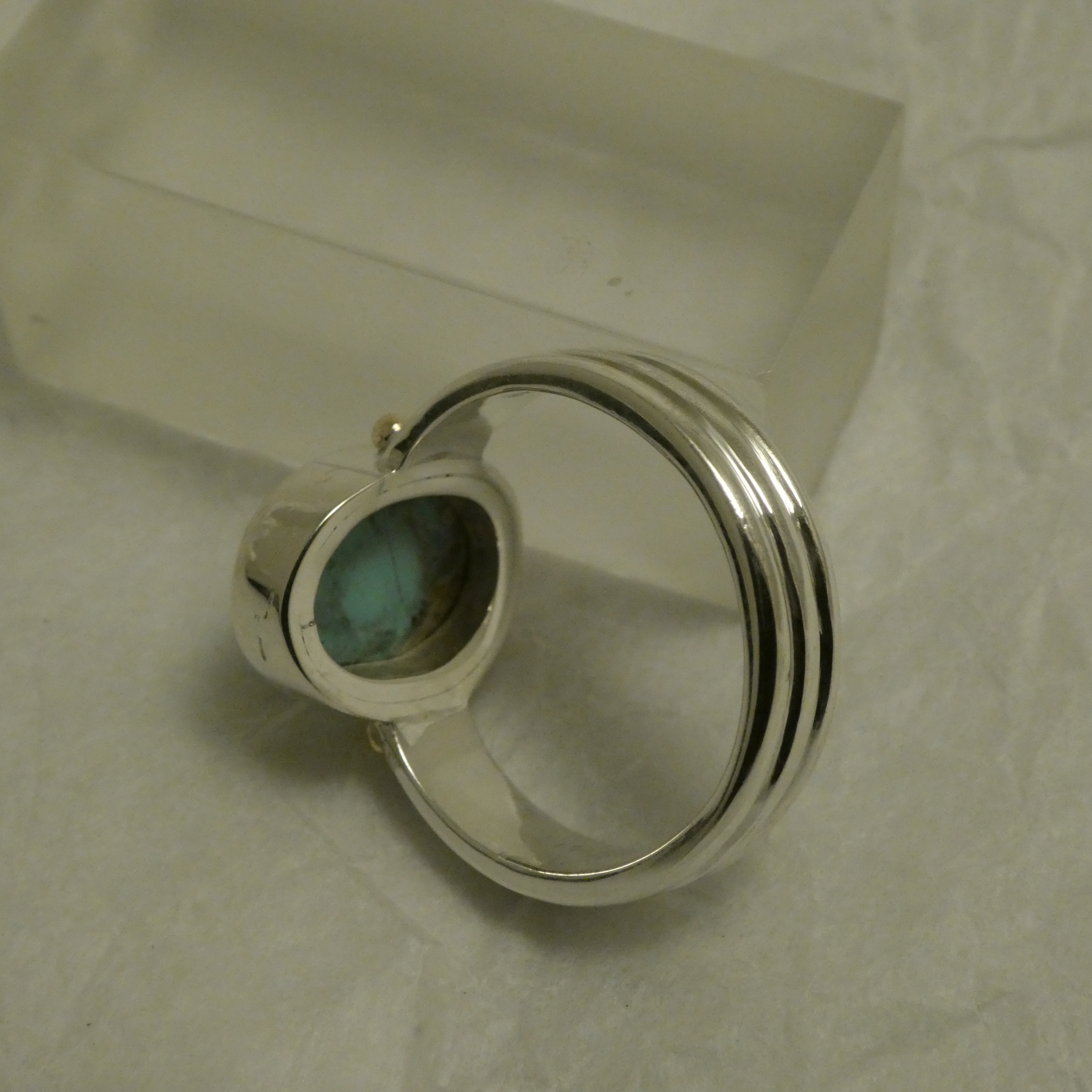 Ring setting crafted in Sydney especially for this Turquoise gemstone, a very solid Sterling Silver band, the gemstone mount handworked in Silver. Solid 9ct Gold granules highlight the marriage of band and setting.