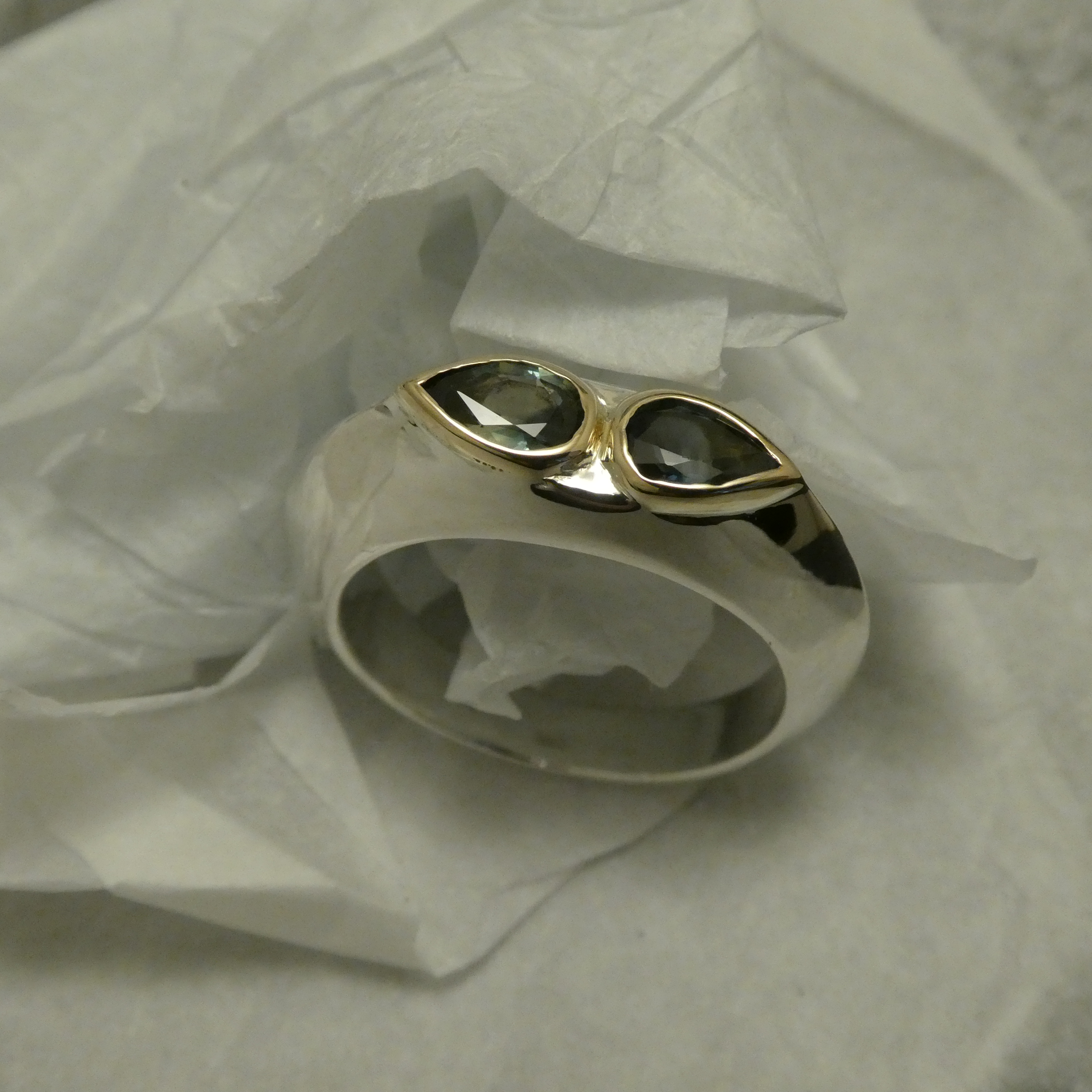 SOLD. Two parti coloured Sapphires of tear-shape cut, .84ct in the two, bezel-set in 9ct Gold in a ring of solid Sterling Silver, created and handcrafted in Sydney.