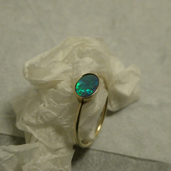 Vivid Boulder Opal, Queensland Australia origin. The silica material of this type of Opal forms in thin layers in the cracks and fissures of large underground ironstone boulders, and usually is so thinly layered that it cannot be extracted without its ironstone backing; hence the name Boulder Opal. The handmade Gold ring setting for the above Vivid Boulder Opal is completely open at the rear of the gemstone, allowing a view of its natural roughish ironstone backing.