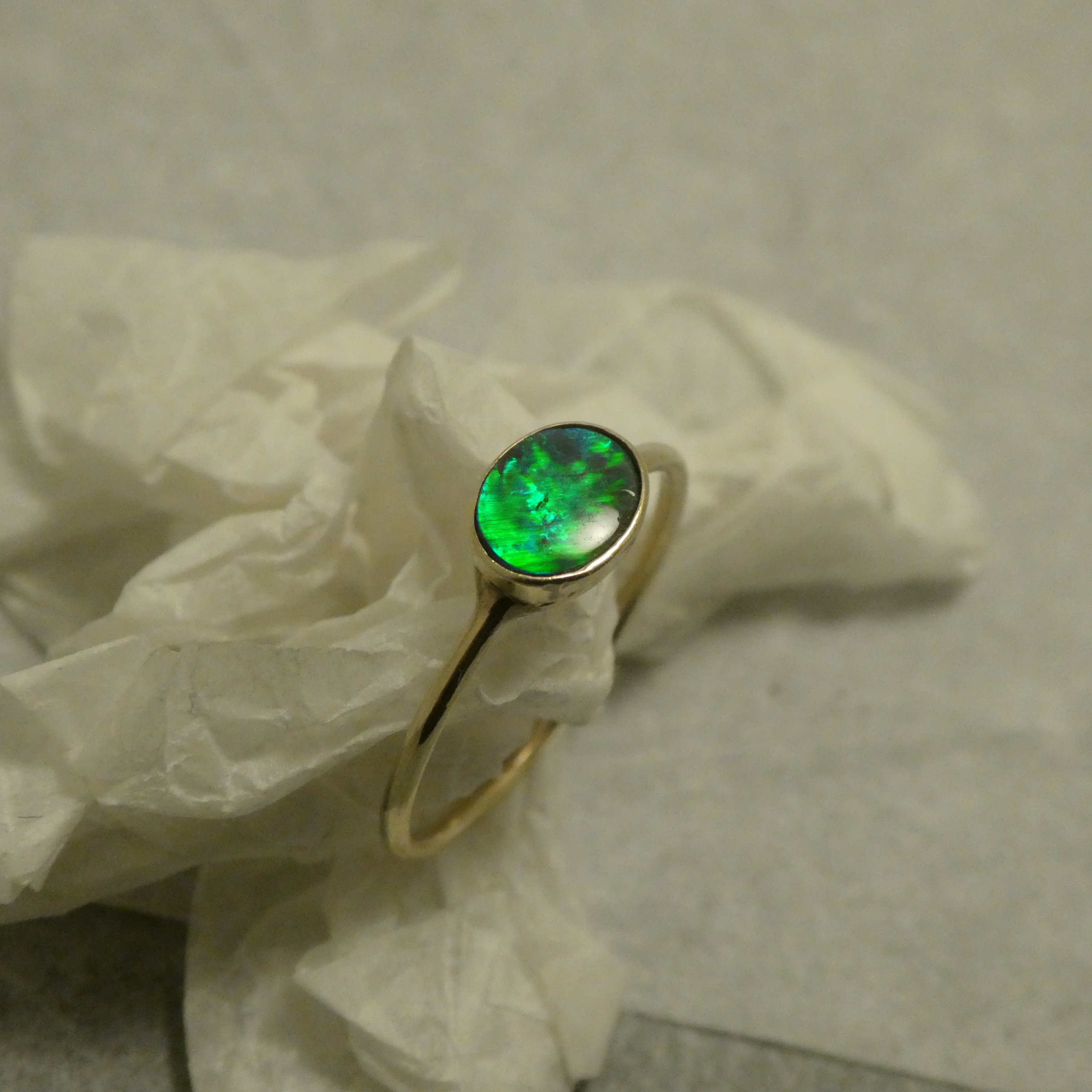 SOLD. Vivid Boulder Opal, origin Queensland, Australia. Oval dimensions 6.5mm x 5mm. Clean face, excellent strong play of colour, across entire gemstone surface, of a scintillating green, with a touch of deep blue when held at an angle.