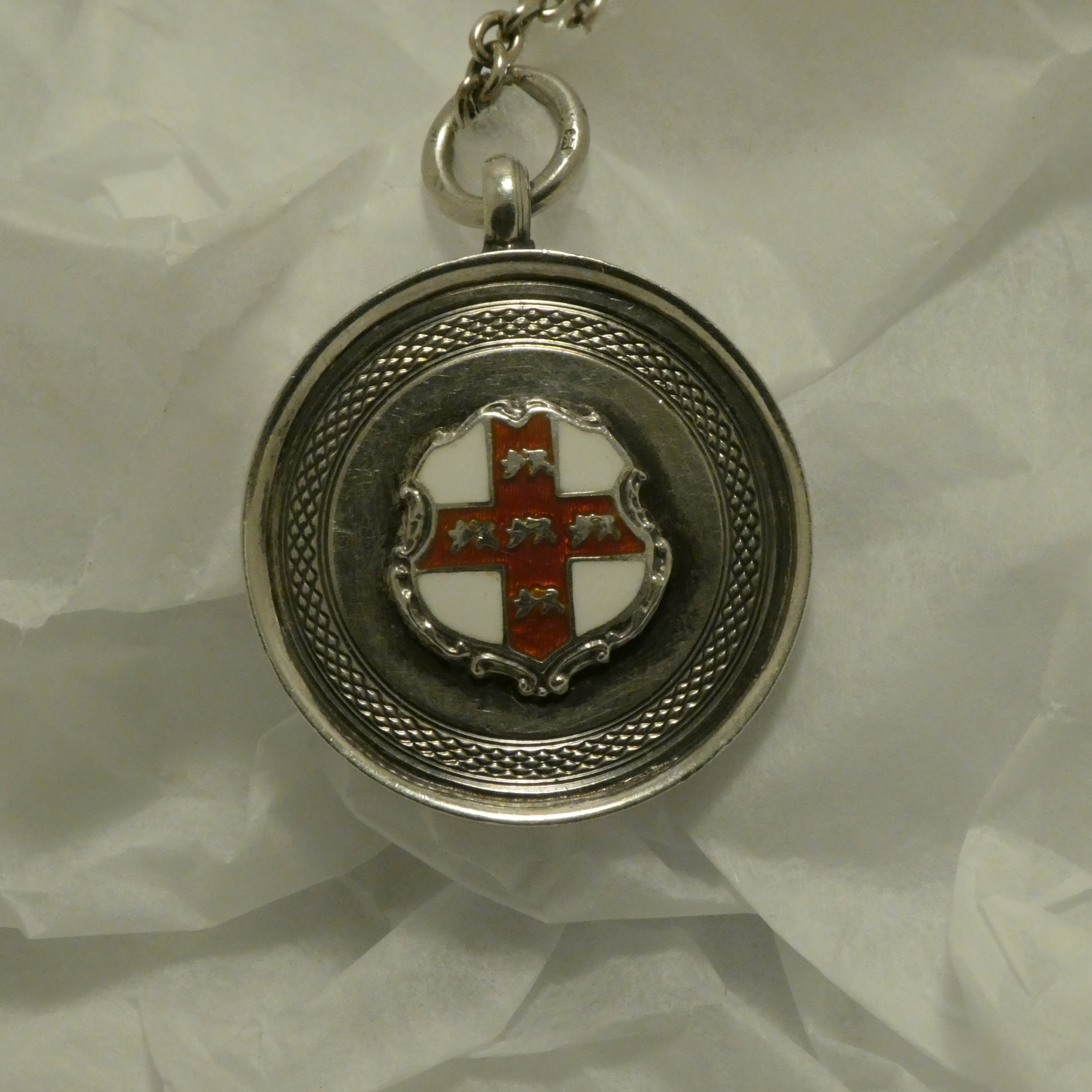 The enamelled heraldic form on the front, red cross on white background, four lions on the cross, indicates the fob was destined for the city of York. York would have had an assay office but had no real Silver production capacity, as Birmingham did. Birmingham produced Silver jewellery for the whole country, indeed was sometimes called “Silver City”.