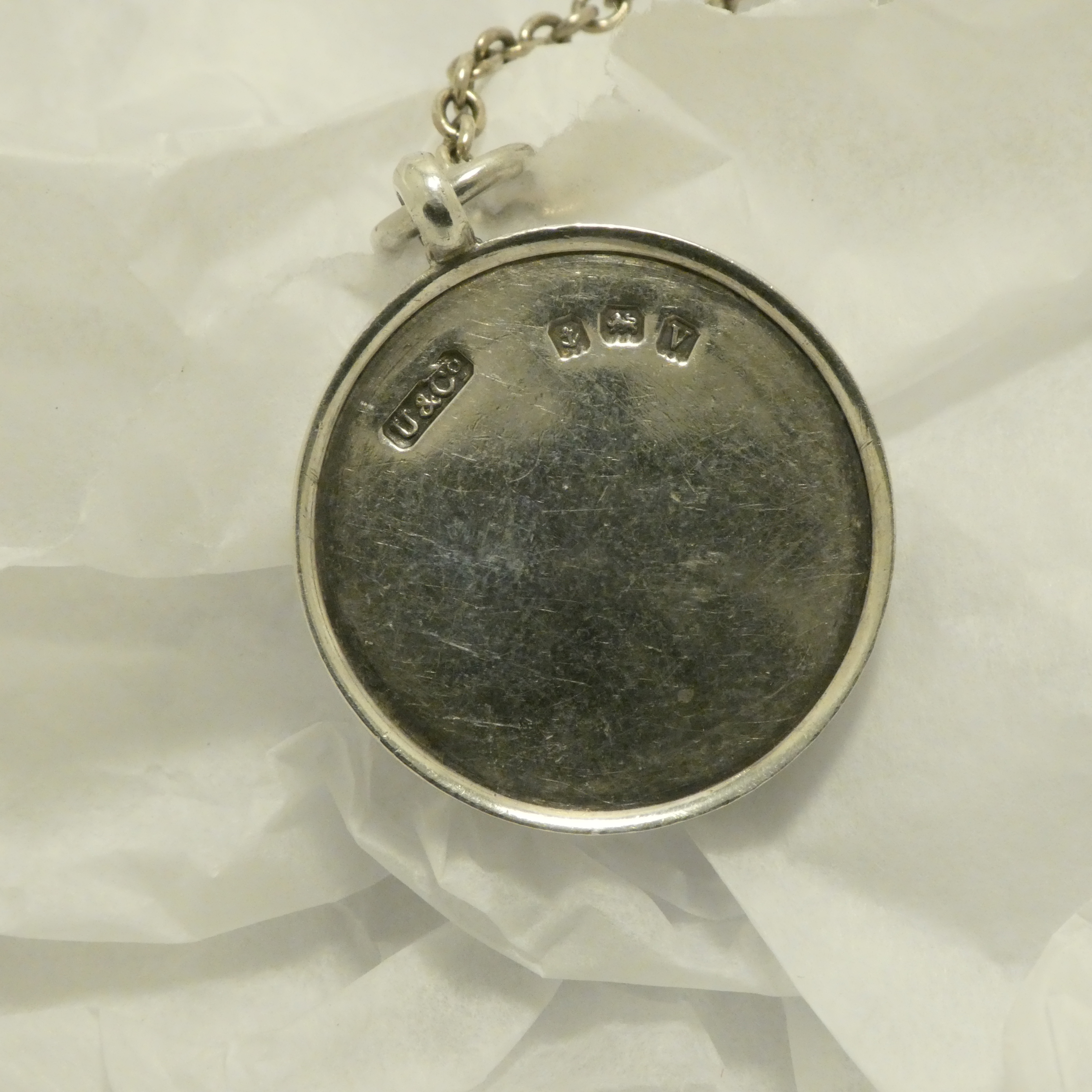 Year 1920 Enamelled Silver fob. Full hallmarks on the rear: “U & Co” the maker, the anchor for Birmingham, the Lion Passant (English mark for 925 Silver), boxed uppercase V for the year 1920. The top Silver ring is also stamped with the Lion Passant.